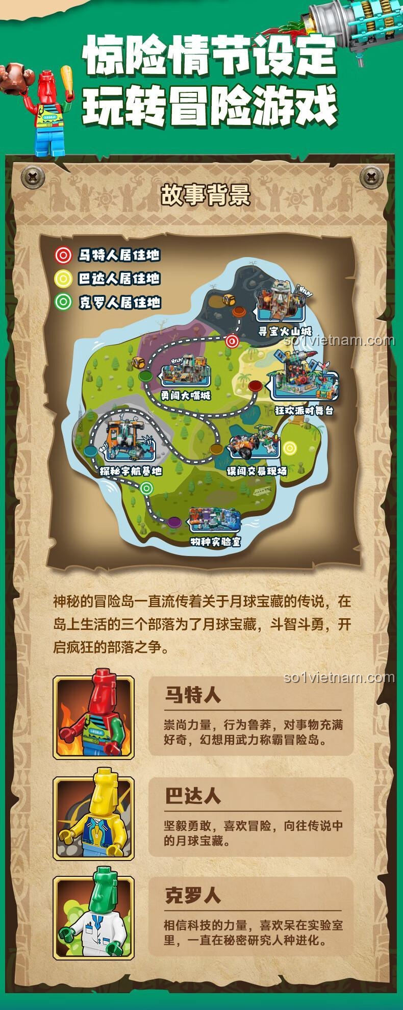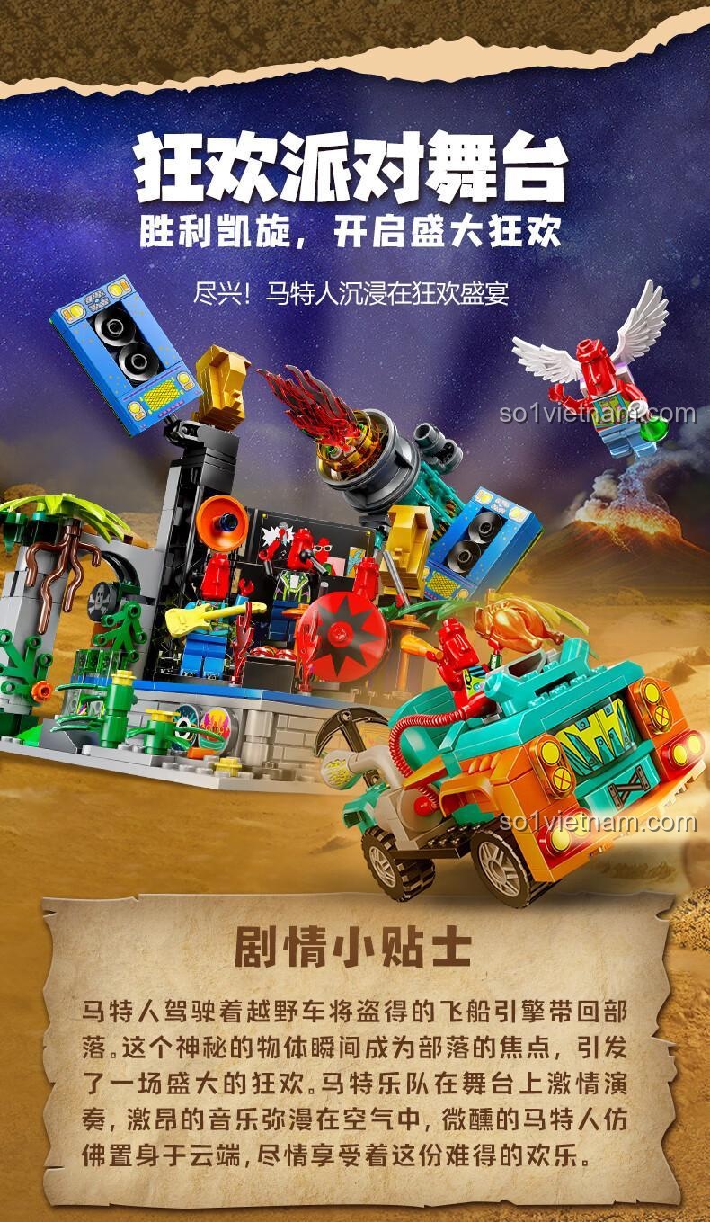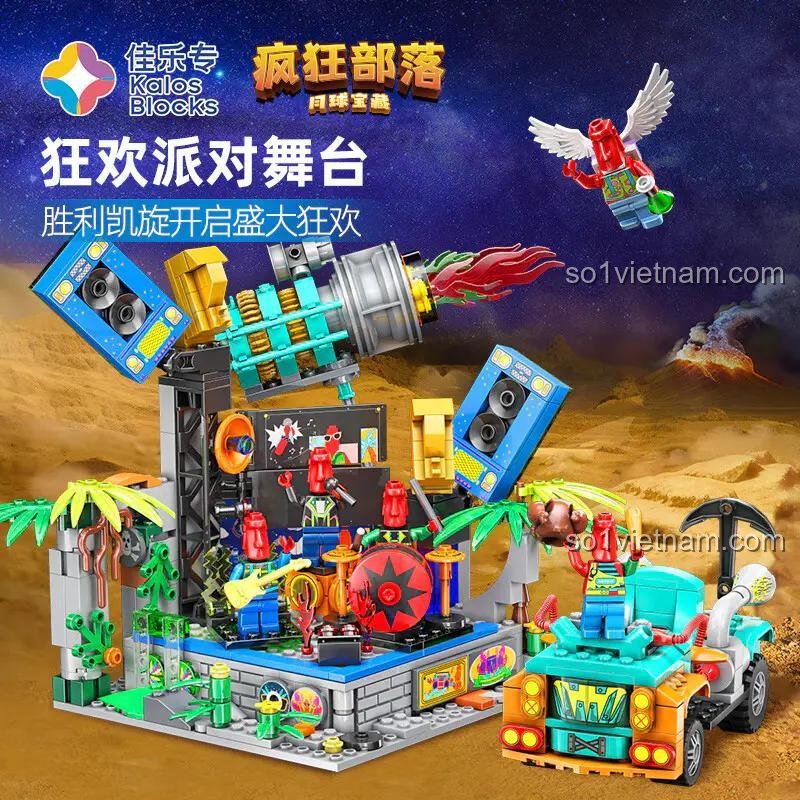 Hỡi các nhà thám hiểm 12 tuổi, bạn đã sẵn sàng đặt chân đến một hòn đảo bí ẩn, nơi những huyền thoại về kho báu và các bộ lạc kỳ lạ vẫn còn vang vọng? Tại đây, ba bộ tộc hùng mạnh – Martin, Bada và Crowe – luôn trong trạng thái cạnh tranh gay gắt. Bộ tộc Martin, với bản tính hoang dã và sùng bái sức mạnh, vừa lập được một chiến công vang dội: đoạt được một động cơ tên lửa bí ẩn! Thay vì dùng nó cho chiến tranh, họ đã làm một điều không ai ngờ tới: biến nó thành tâm điểm cho một đại nhạc hội rock tưng bừng! Bộ lắp ghép Sân khấu lễ hội của bộ lạc Kalos 57002 không chỉ là một món đồ chơi, nó là tấm vé mời bạn tham gia vào chính lễ hội điên cuồng và đầy hứng khởi đó. Hãy cùng những người Martin ‘say xỉn’ vì âm nhạc, tận hưởng niềm vui chiến thắng và sáng tạo nên những giai điệu của riêng mình. Một câu chuyện phiêu lưu và âm nhạc đang chờ bạn khám phá!