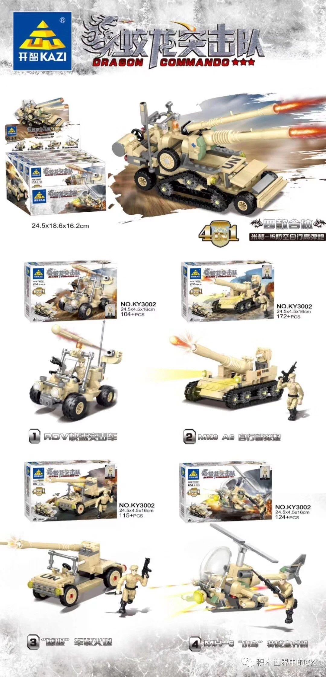 Dòng Đồ chơi mô hình KY3002-4 tập trung vào các phương tiện quân sự đa năng. Ngoài mô hình Pháo Phòng Không Tự Hành MiG-15 kết hợp, bộ này còn cho phép lắp ráp riêng lẻ Xe Đột Kích RDV, Pháo Tự Hành M109 A8, Pháo Gắn Xe ‘Ưng Nhãn’ và Trực Thăng MH-6 ‘Chim Nhỏ’, mang đến sự đa dạng trong trải nghiệm chơi.