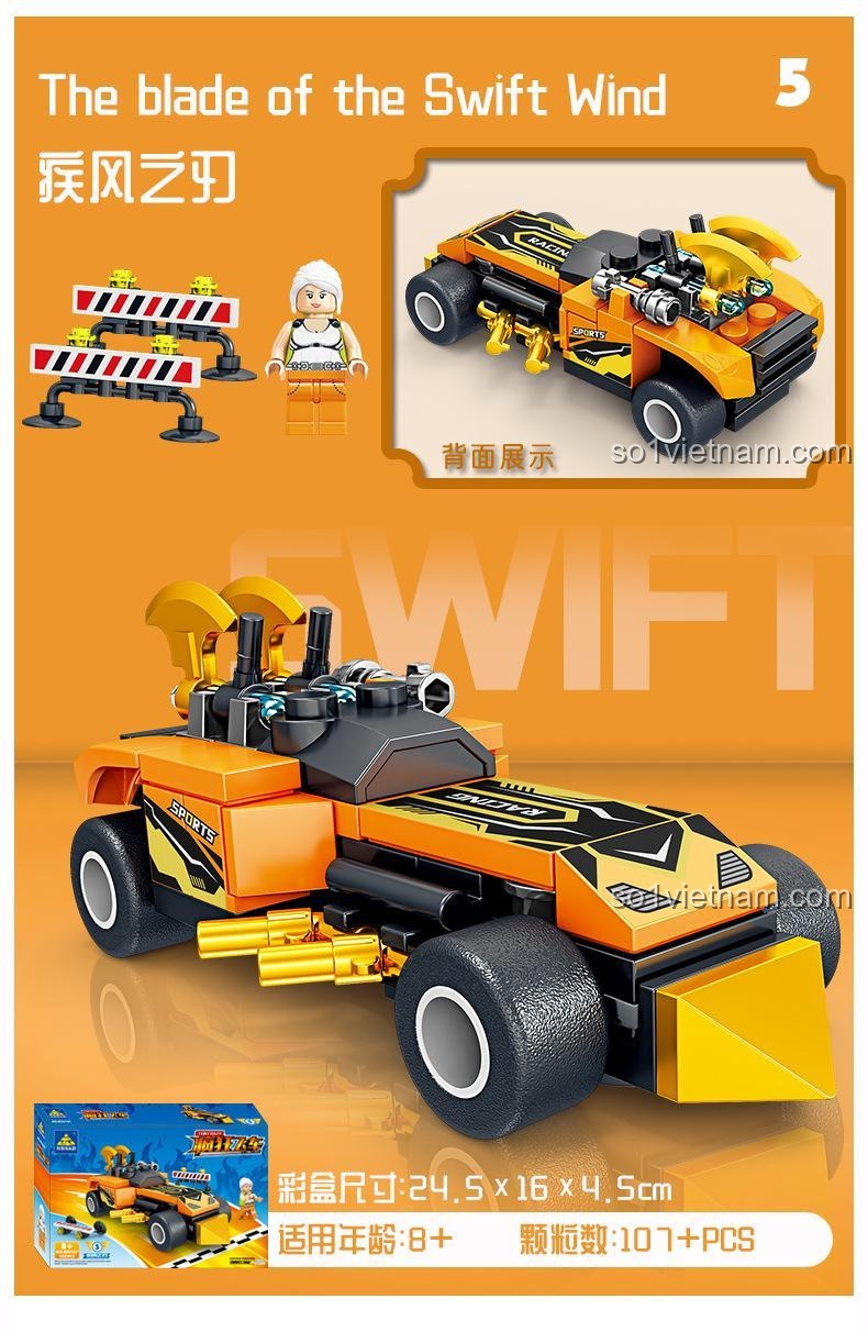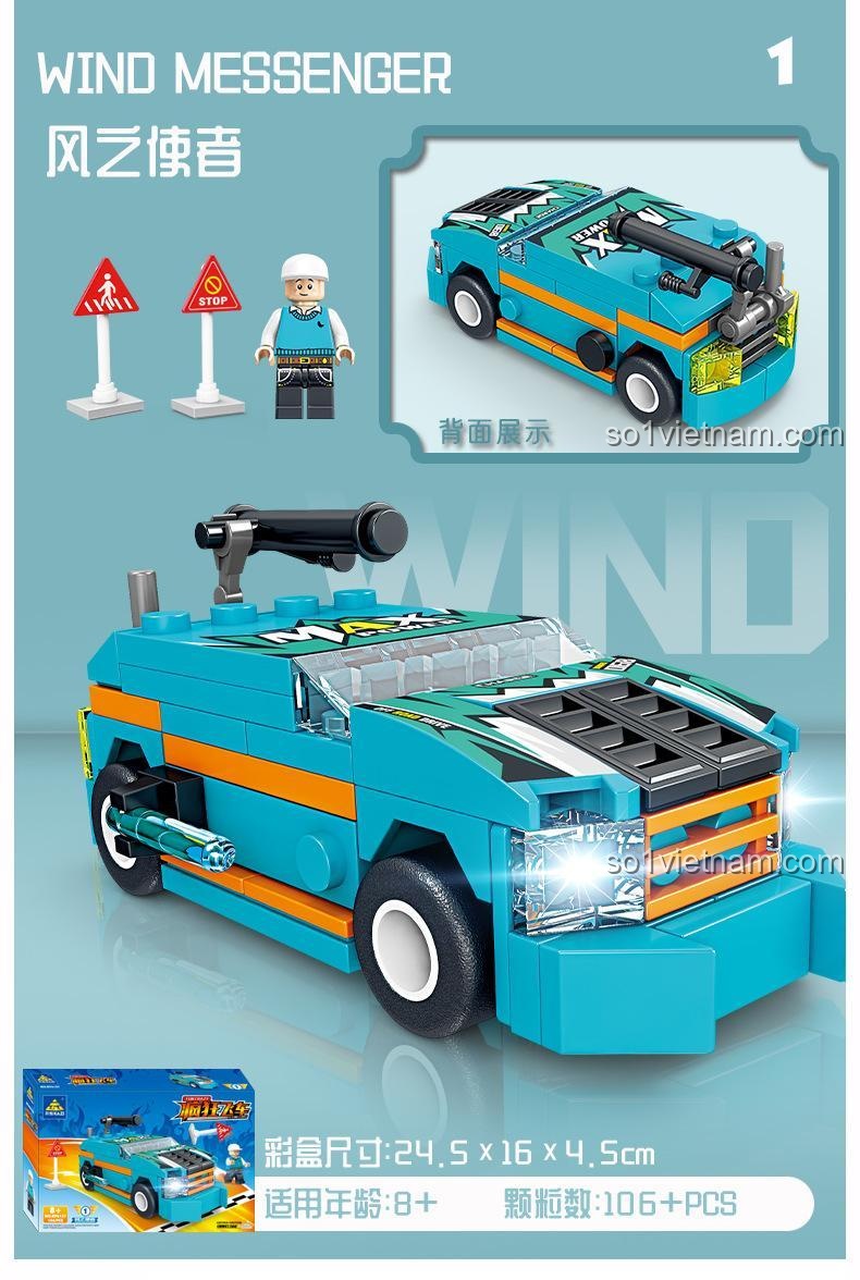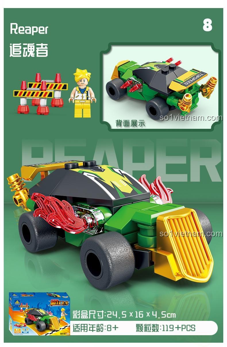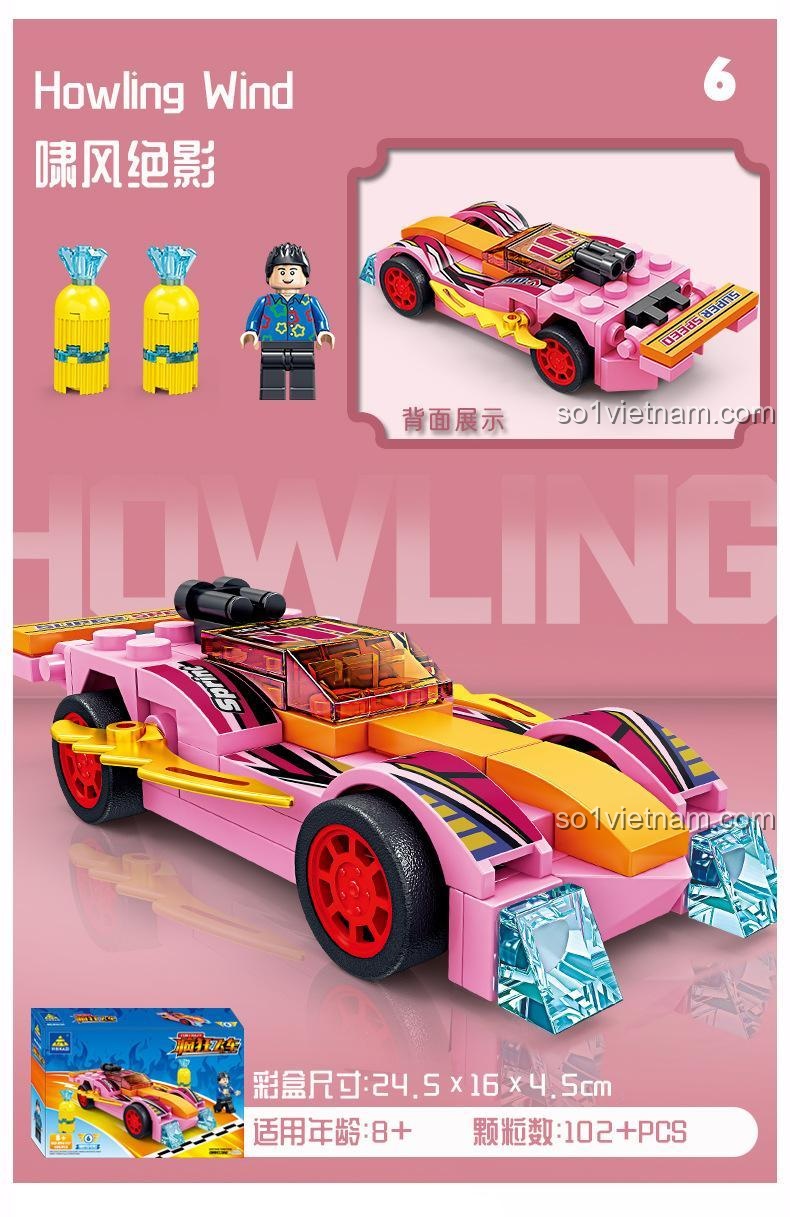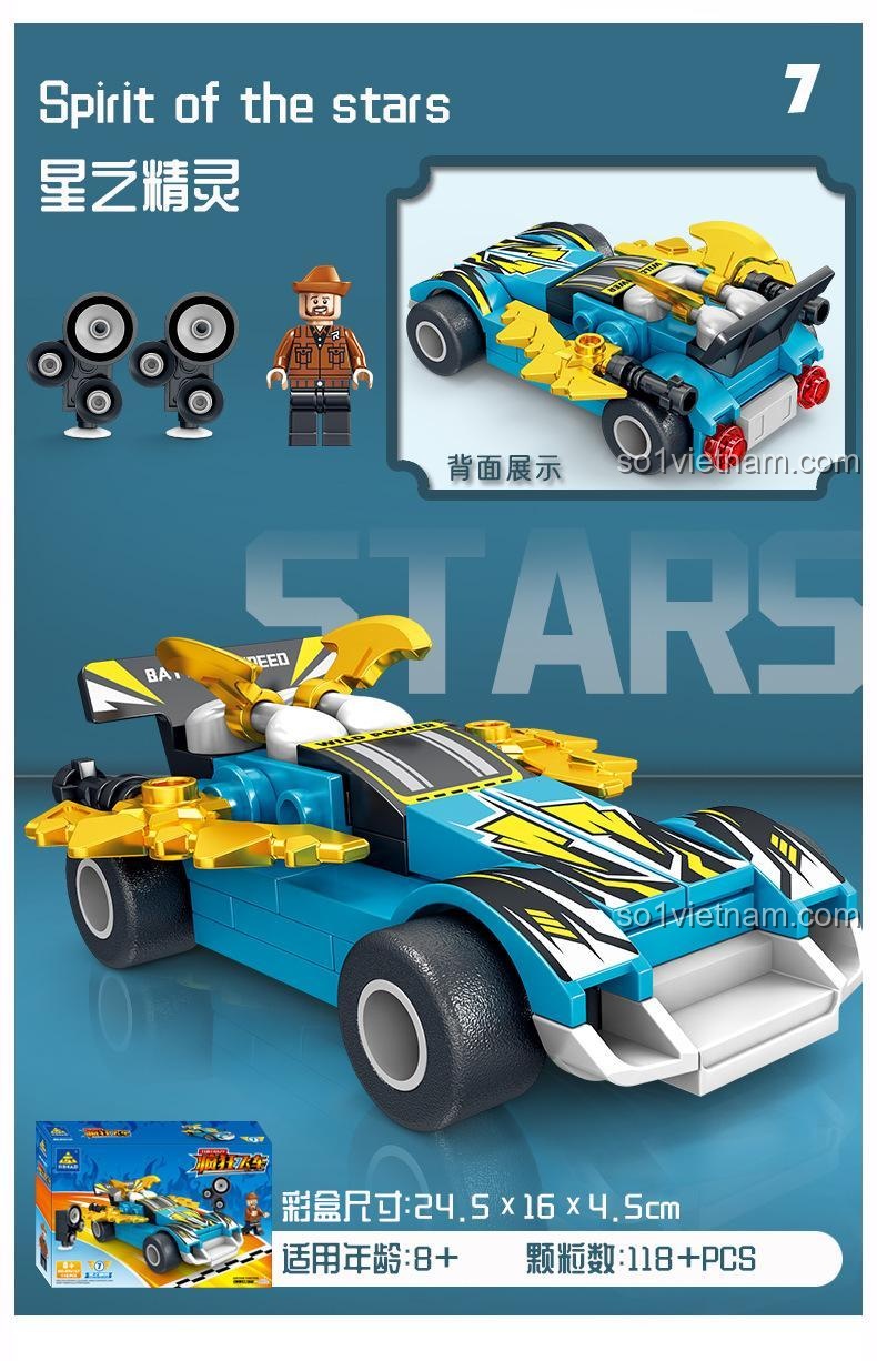 Bộ sản phẩm bao gồm 8 mẫu xe với các tên gọi đầy ấn tượng như Wind Messenger, Lightning Storm, Dauntless Chariot, Fire Nova, The Blade of the Swift Wind, Howling Wind, Spirit of the Stars và Reaper. Mỗi tên gọi đều gợi lên một câu chuyện, một cuộc phiêu lưu, kích thích trí tưởng tượng của bé. Các chi tiết được gia công chính xác, đảm bảo độ khít hoàn hảo khi lắp ráp, mang lại trải nghiệm mượt mà và cảm giác hài lòng khi mô hình hoàn chỉnh hiện ra trước mắt. Từ những chiếc lốp gai góc của xe địa hình đến cánh gió thể thao của siêu xe, mọi yếu tố đều được chăm chút để tạo nên một tổng thể ấn tượng, xứng đáng là niềm tự hào của bất kỳ tay đua nhí nào.