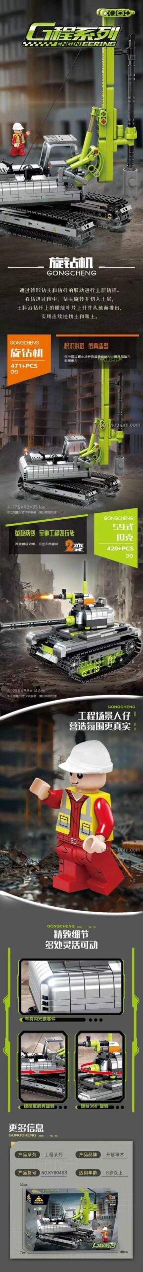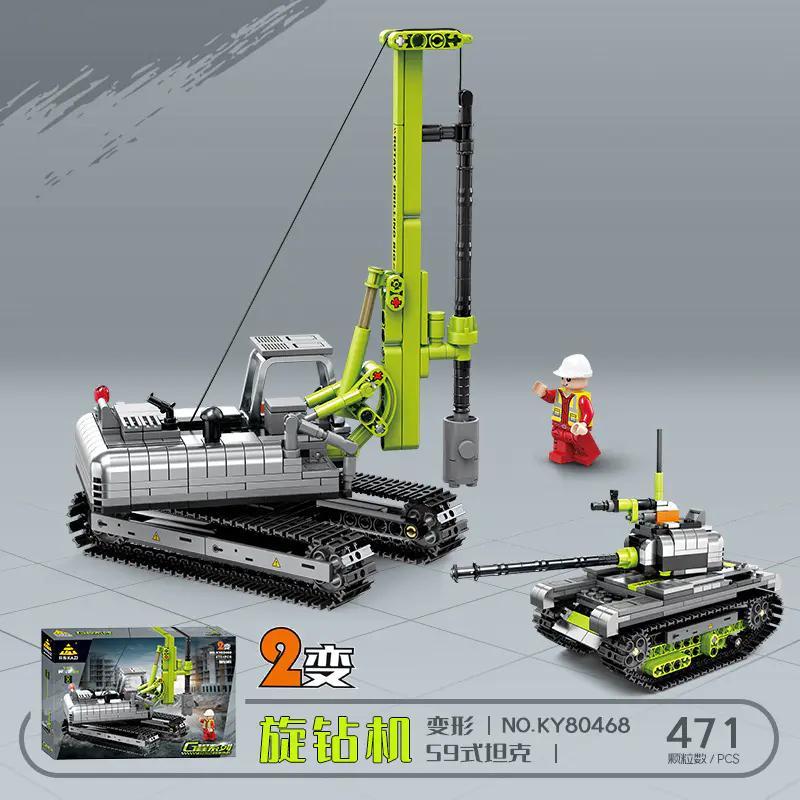 Bộ sản phẩm cho phép lắp ráp thành 2 mẫu: Xe khoan với cần cẩu và mũi khoan xoay, cùng Xe tăng 59 với nòng pháo di chuyển được. Ngoài ra, sản phẩm còn đi kèm một minifigure thợ xây dựng.