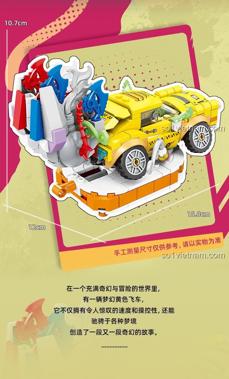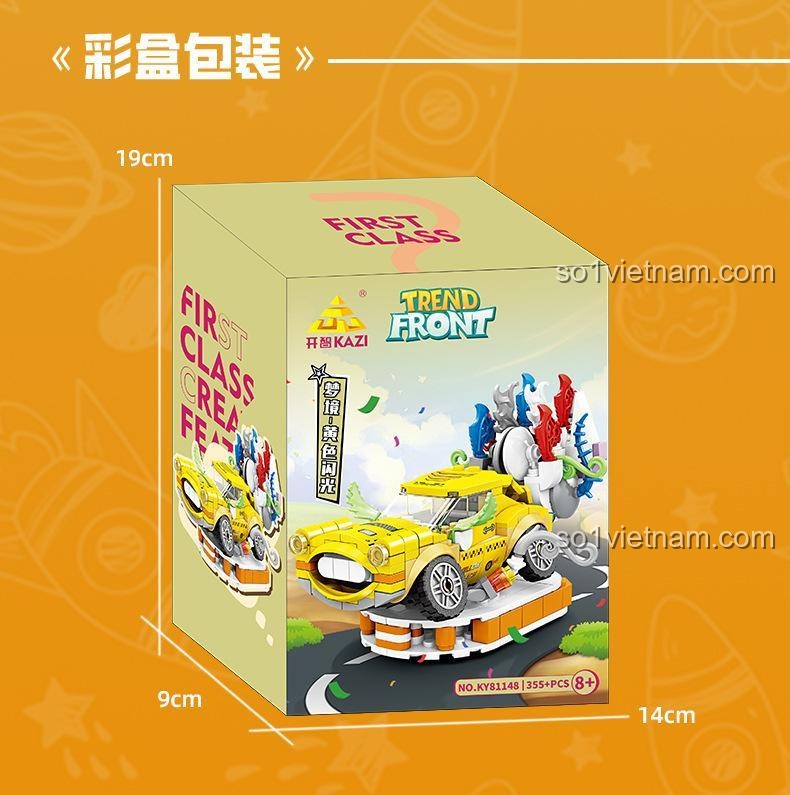 Bộ lắp ghép KAZI KY81148 nổi bật với thiết kế “Cơn Lốc Vàng” độc đáo, mang đến một diện mạo hoàn toàn mới lạ và đầy cuốn hút cho mô hình xe hơi. Tông màu vàng chủ đạo rực rỡ, kết hợp cùng các chi tiết màu trắng, đỏ, xanh dương và xám tạo nên một tổng thể hài hòa, bắt mắt. Mô hình có kích thước ấn tượng với chiều dài 15.8cm, chiều rộng 12cm và chiều cao 10.7cm, vừa vặn để bé dễ dàng cầm nắm và trưng bày. Đặc biệt, khả năng xoay 360 độ bằng tay quay tích hợp mang đến trải nghiệm tương tác thú vị, giúp bé khám phá mọi góc cạnh của “chiến mã” tốc độ này. Từng chi tiết nhỏ như đèn pha, lưới tản nhiệt, bánh xe đều được mô phỏng tỉ mỉ, mang lại cảm giác chân thực và sống động.