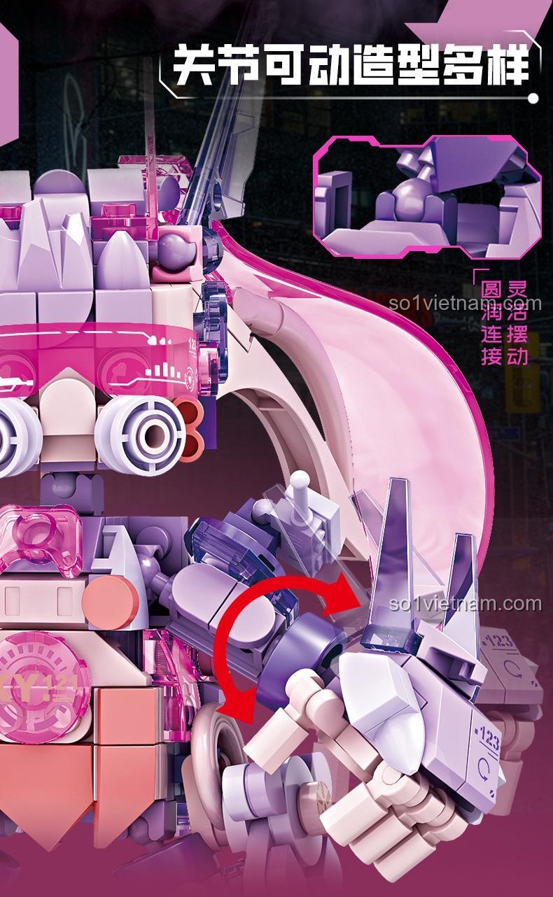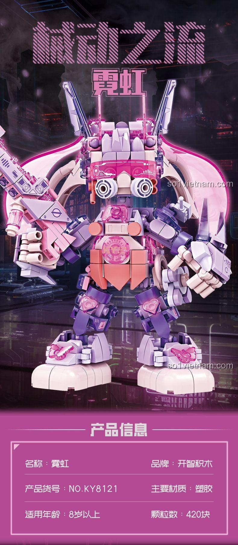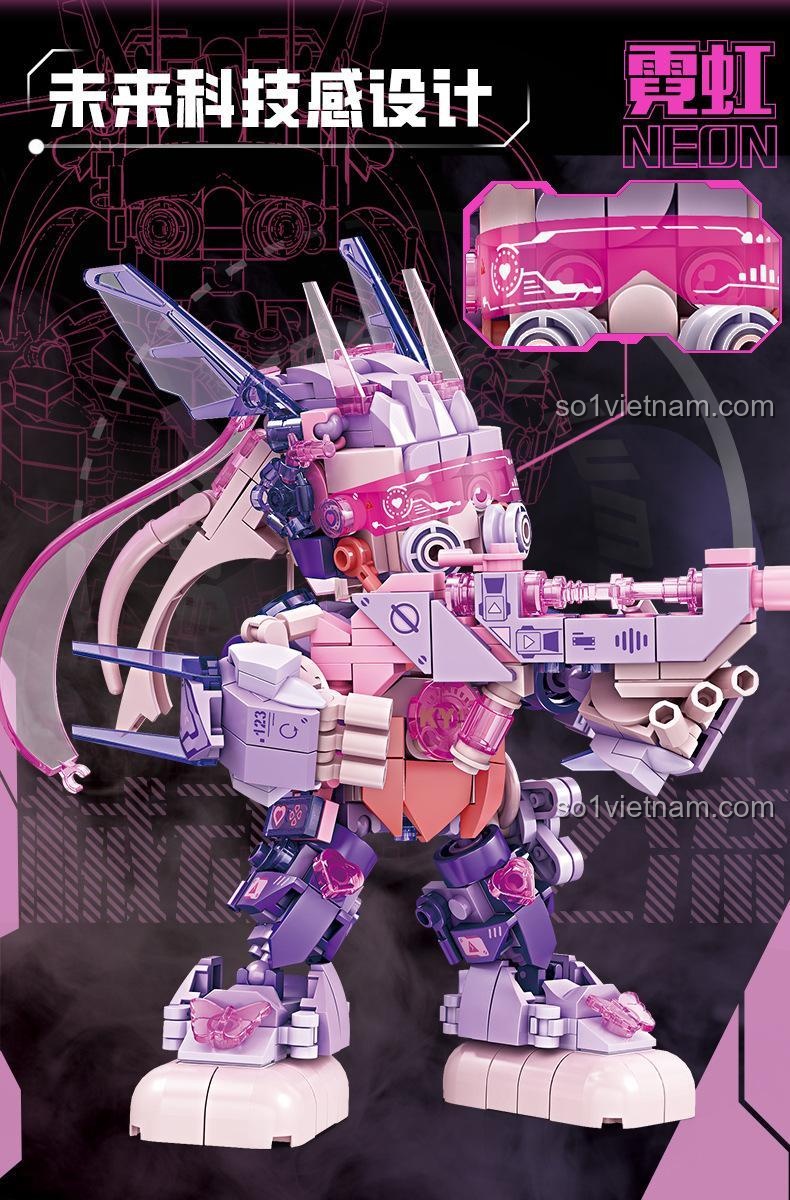 KAZI KY8121 Robot Neon Phát Sáng gây ấn tượng mạnh mẽ với thiết kế cyberpunk độc đáo và bảng màu chủ đạo Hồng, Tím, Trắng, Xanh dương đầy cá tính. Mô hình có chiều cao 17.7 cm, chiều dài 16.3 cm và chiều rộng 13.2 cm, tạo nên một dáng vẻ cân đối và mạnh mẽ. Từng chi tiết nhỏ được chăm chút tỉ mỉ, từ những đường nét góc cạnh, các chi tiết trong suốt lấp lánh cho đến vũ khí súng laser cầm tay, tất cả đều toát lên vẻ hiện đại và tinh xảo.