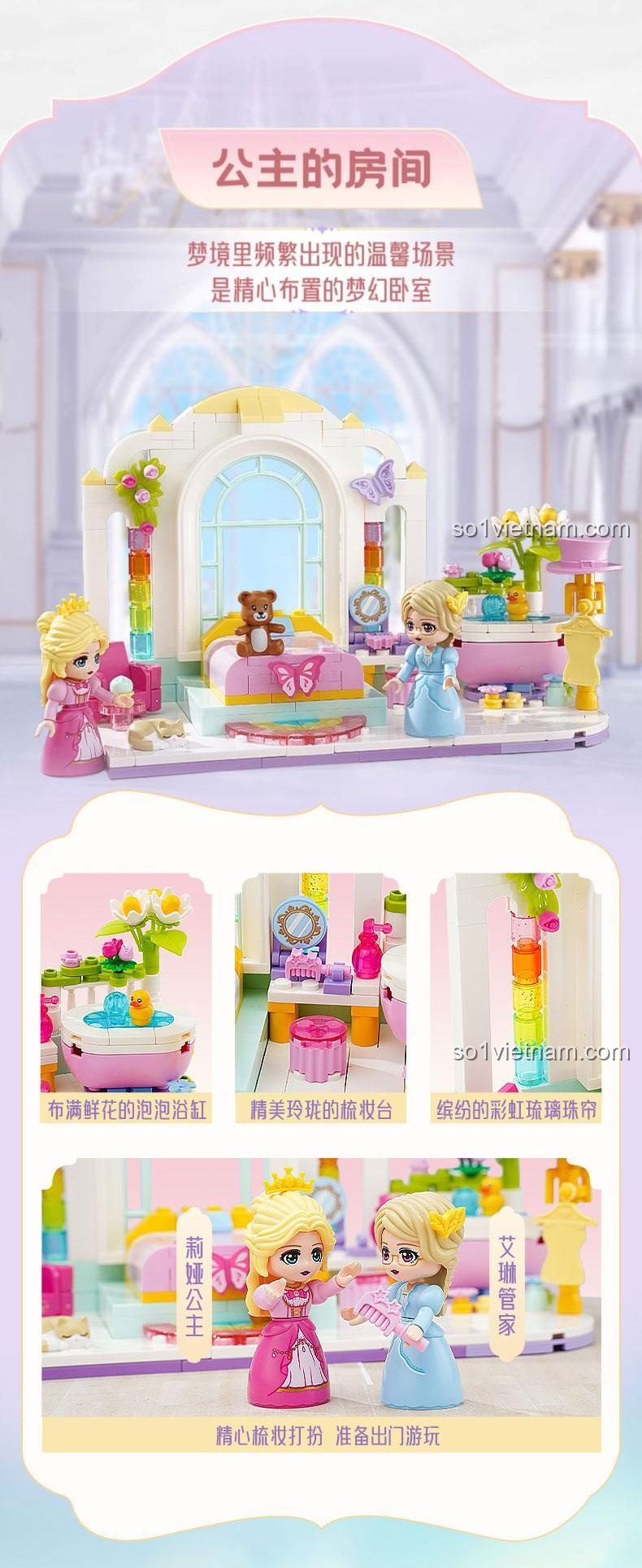Điểm nhấn của bộ sản phẩm là sự xuất hiện của 2 minifigures công chúa xinh đẹp, cùng các phụ kiện trang trí chi tiết, giúp bé thỏa sức sáng tạo và nhập vai vào câu chuyện cổ tích.