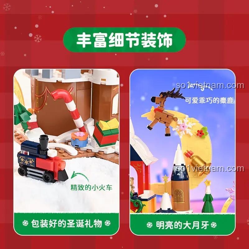 - Kết hợp với các bộ đồ chơi chủ đề mùa đông hoặc lễ hội khác để tạo ra một thị trấn Giáng Sinh lớn hơn.