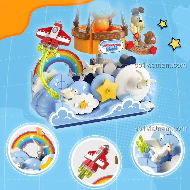 Điểm nhấn độc đáo của bộ lắp ghép Femibox S44074 chính là tính năng xoay tích hợp trên chiếc khinh khí cầu. Thông qua một cơ chế quay đơn giản, bé có thể dễ dàng làm cho chiếc khinh khí cầu quay tròn, tạo hiệu ứng chuyển động sống động và tăng thêm phần hấp dẫn cho trò chơi. Tính năng này không chỉ mang lại sự thích thú mà còn giúp bé khám phá nguyên lý hoạt động cơ bản của các bộ phận cơ khí.