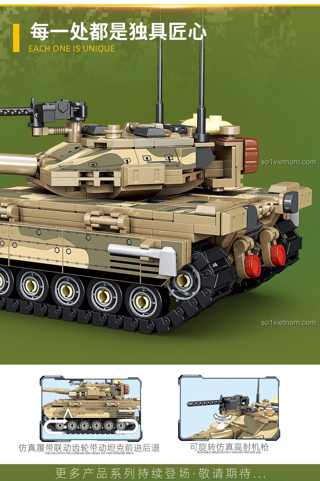 Mô hình Xe Tăng Chủ Lực Merkava MK4 này nổi bật với tháp pháo có thể xoay 360 độ, nòng pháo nâng hạ linh hoạt và hệ thống bánh xích di chuyển mượt mà. Ngoài ra, súng máy phòng không cũng có thể xoay, tăng thêm tính chân thực cho trải nghiệm chơi.