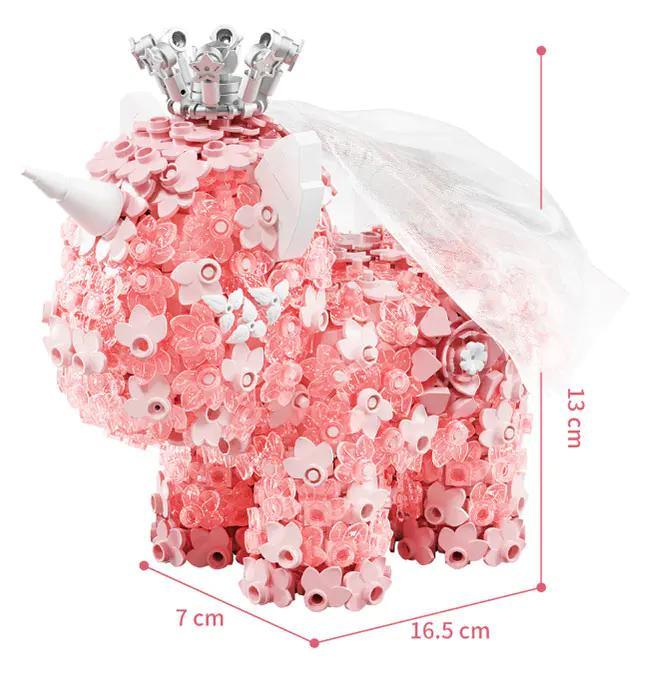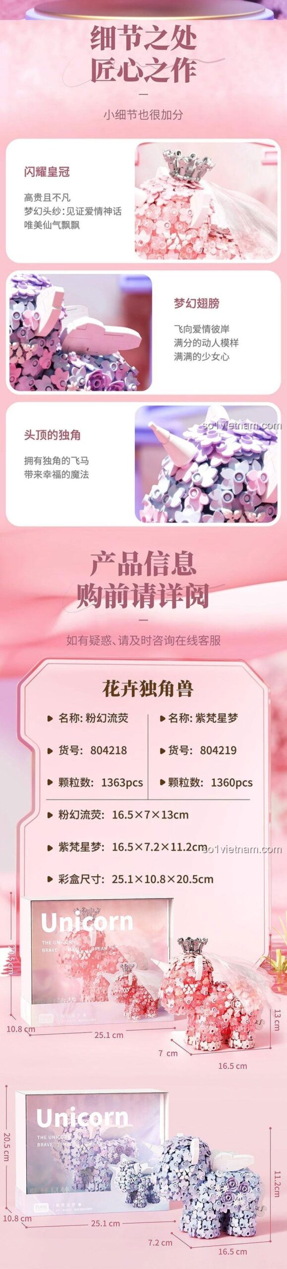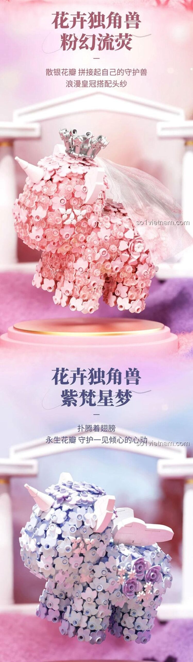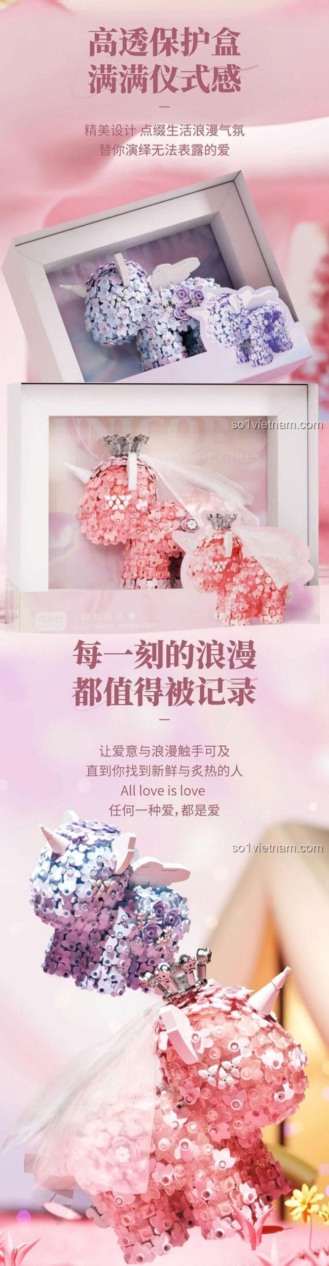 Màu sắc chủ đạo là sự kết hợp hài hòa giữa sắc hồng ngọt ngào và sắc tím thủy chung, tạo nên một tổng thể dịu dàng, lãng mạn, rất phù hợp với sở thích của các bé gái. Chi tiết vương miện lấp lánh trên đầu kỳ lân càng làm tăng thêm vẻ quyền quý và phép thuật. Mỗi cánh hoa nhỏ được ghép lại với nhau một cách khéo léo, tạo nên hiệu ứng thị giác độc đáo, khiến mô hình trở nên sống động và thu hút hơn bao giờ hết.