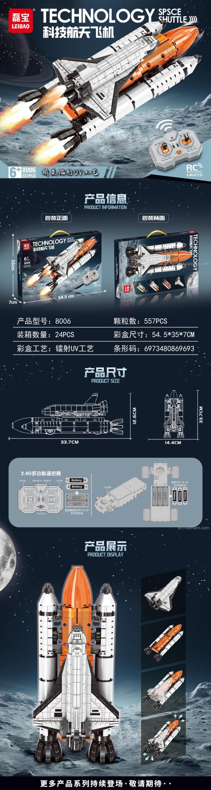 Bộ lắp ghép LEIBAO 8006 Tàu Con Thoi không chỉ mang đến niềm vui lắp ráp mà còn là cơ hội tuyệt vời để bé tìm hiểu về lịch sử hàng không vũ trụ, kích thích trí tò mò và ước mơ chinh phục những vì sao. Hãy để bé trai của bạn trở thành phi hành gia nhí, khám phá những bí ẩn của vũ trụ ngay tại căn phòng của mình với đồ chơi lắp ráp Máy Bay Con Thoi đầy ấn tượng này!