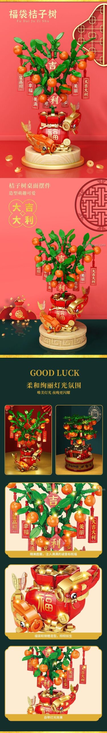 Bộ xếp hình Cây Kim Quất tài lộc LELE BROTHER 9022 gây ấn tượng mạnh mẽ với thiết kế vô cùng tinh xảo và sống động. Mô hình tái hiện chân thực một cây kim quất sum suê quả, với những trái cam tròn đầy, căng mọng tượng trưng cho sự viên mãn, tài lộc dồi dào. Màu sắc chủ đạo là cam rực rỡ, xanh lá tươi tắn của lá, cùng điểm nhấn đỏ và vàng của các chi tiết trang trí, tạo nên một tổng thể hài hòa và bắt mắt.