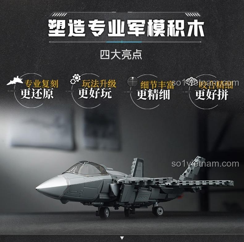 • Chi tiết tinh xảo: Từ phần mũi máy bay sắc bén, buồng lái trong suốt đến các khe hút gió và động cơ phản lực, tất cả đều được tái hiện một cách sống động.