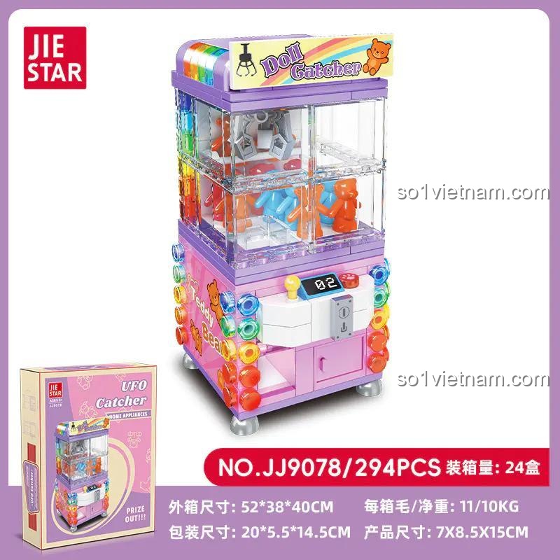 Bộ lắp ghép JIESTAR JJ9078 nổi bật với thiết kế máy gắp thú bông vô cùng đáng yêu và sinh động. Với 294 mảnh ghép được chế tác tỉ mỉ, bé sẽ được tự tay xây dựng nên một mô hình máy gắp thú bông thu nhỏ, với: