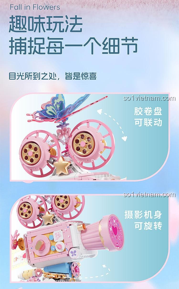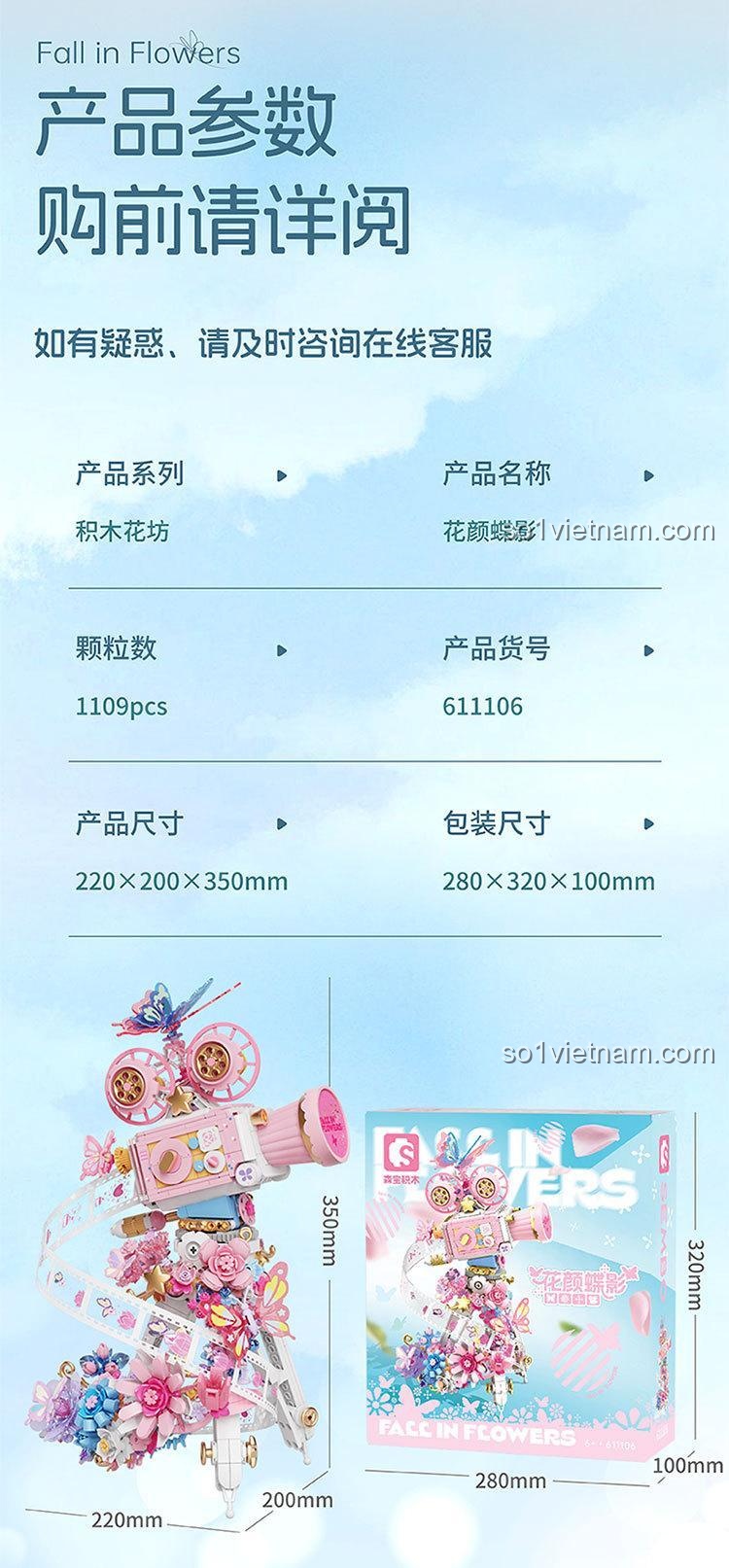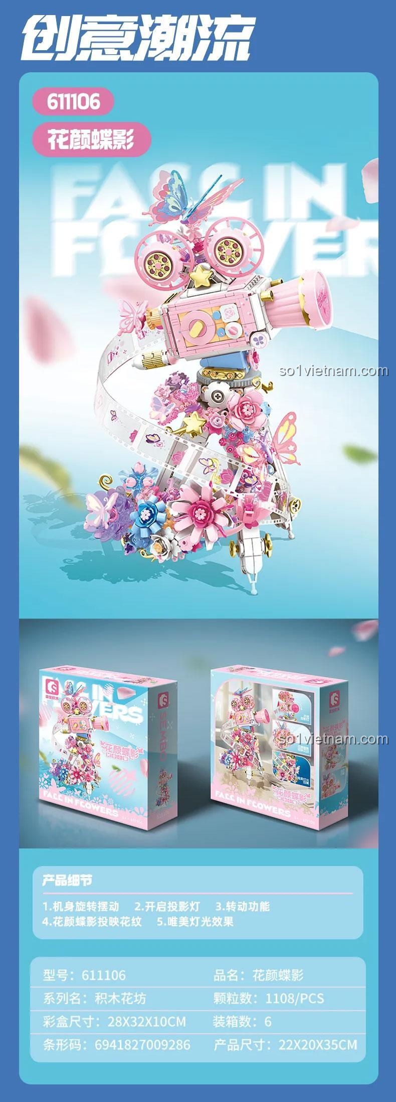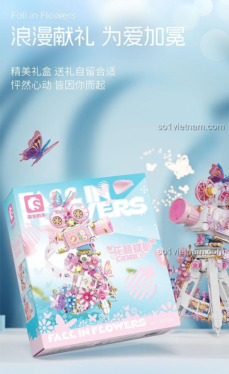 Bộ lắp ghép SEMBO 611106 có các tính năng như ống kính và bánh răng có thể xoay, tích hợp đèn LED tạo hiệu ứng lung linh, cùng với thiết kế hoa và bướm vô cùng tinh xảo.