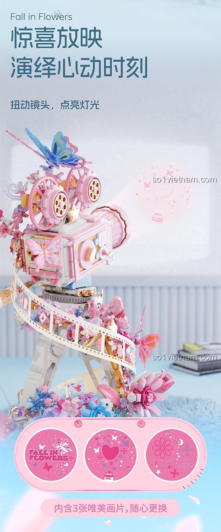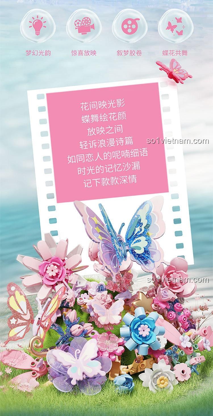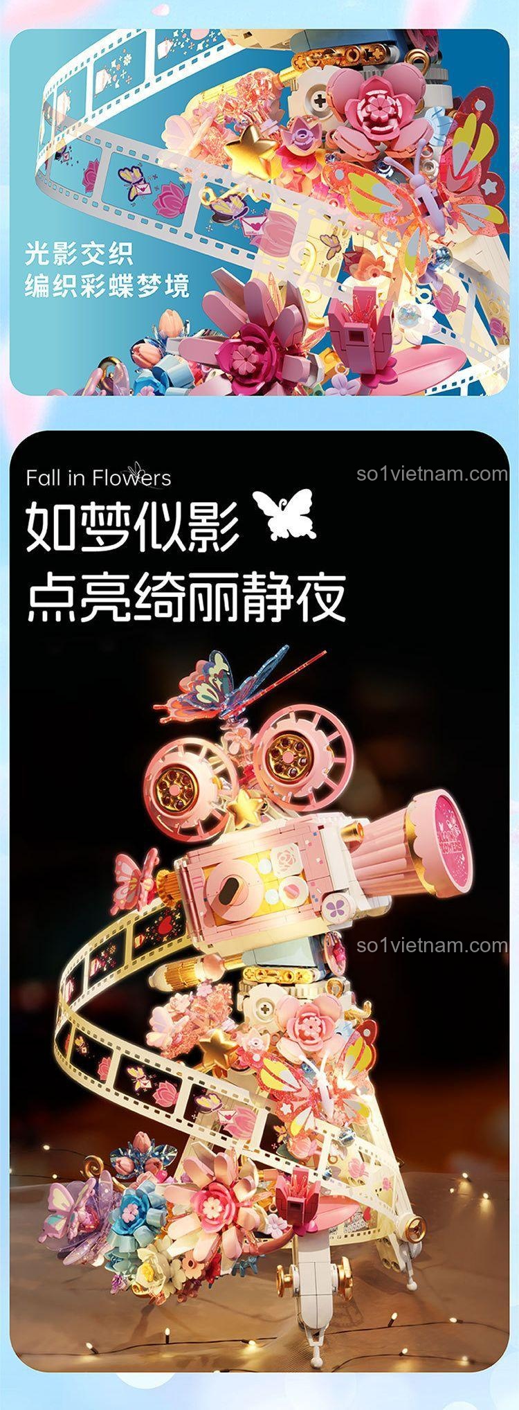 Bộ lắp ghép SEMBO 611106 có các tính năng như ống kính và bánh răng có thể xoay, tích hợp đèn LED tạo hiệu ứng lung linh, cùng với thiết kế hoa và bướm vô cùng tinh xảo.