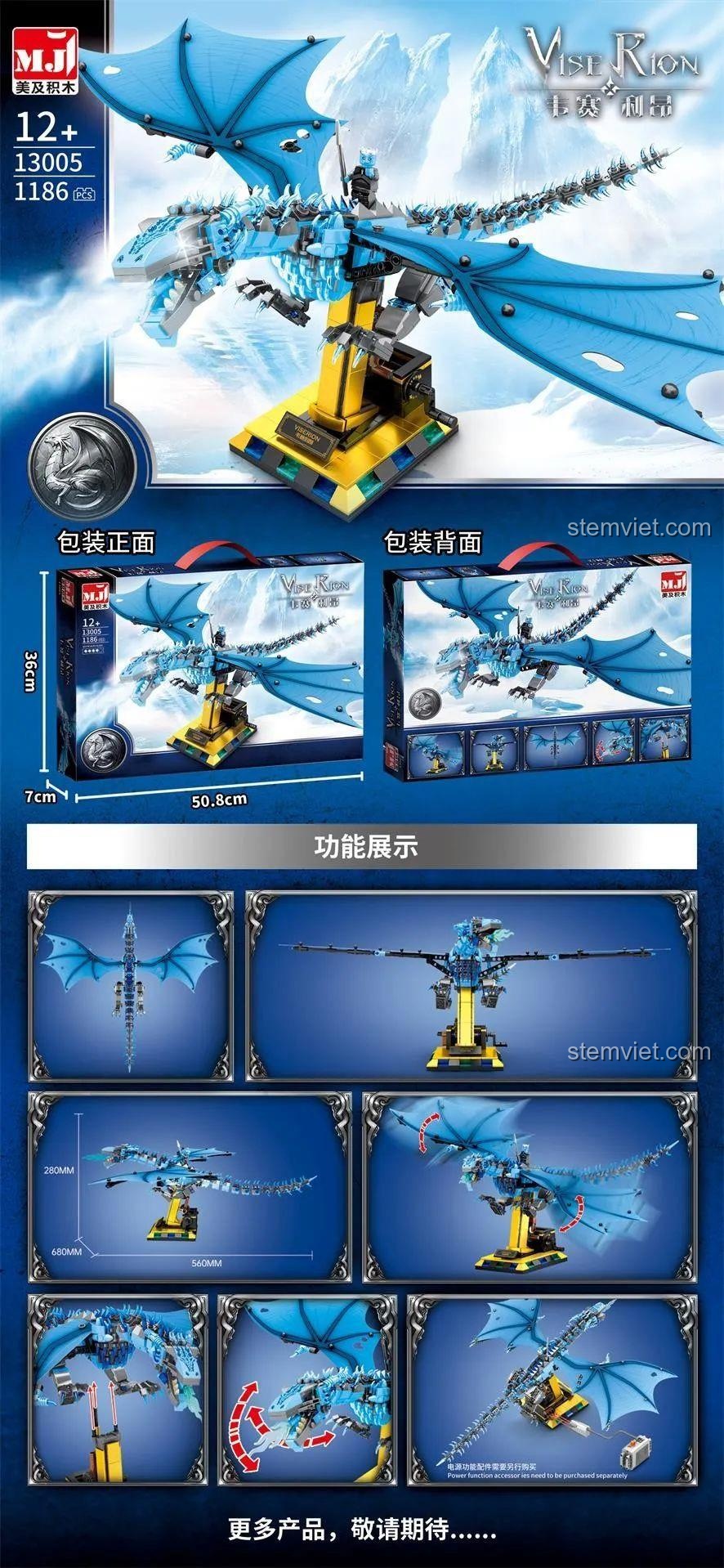 Bộ đồ chơi mô hình 13005 Rồng Băng Viserion từ Meiji Blocks là một kiệt tác thực sự, được thiết kế tỉ mỉ để tái hiện chân thực hình ảnh rồng băng huyền thoại. Với màu sắc chủ đạo là xanh dương băng giá, kết hợp cùng các chi tiết đen, xám và vàng ở phần đế, mô hình này toát lên vẻ đẹp hùng vĩ và đầy uy lực. Kích thước ấn tượng 56cm chiều dài, 68cm chiều rộng (sải cánh) và 28cm chiều cao, Viserion sẽ trở thành tâm điểm nổi bật trong bộ sưu tập của bất kỳ học sinh cấp 2 nào.