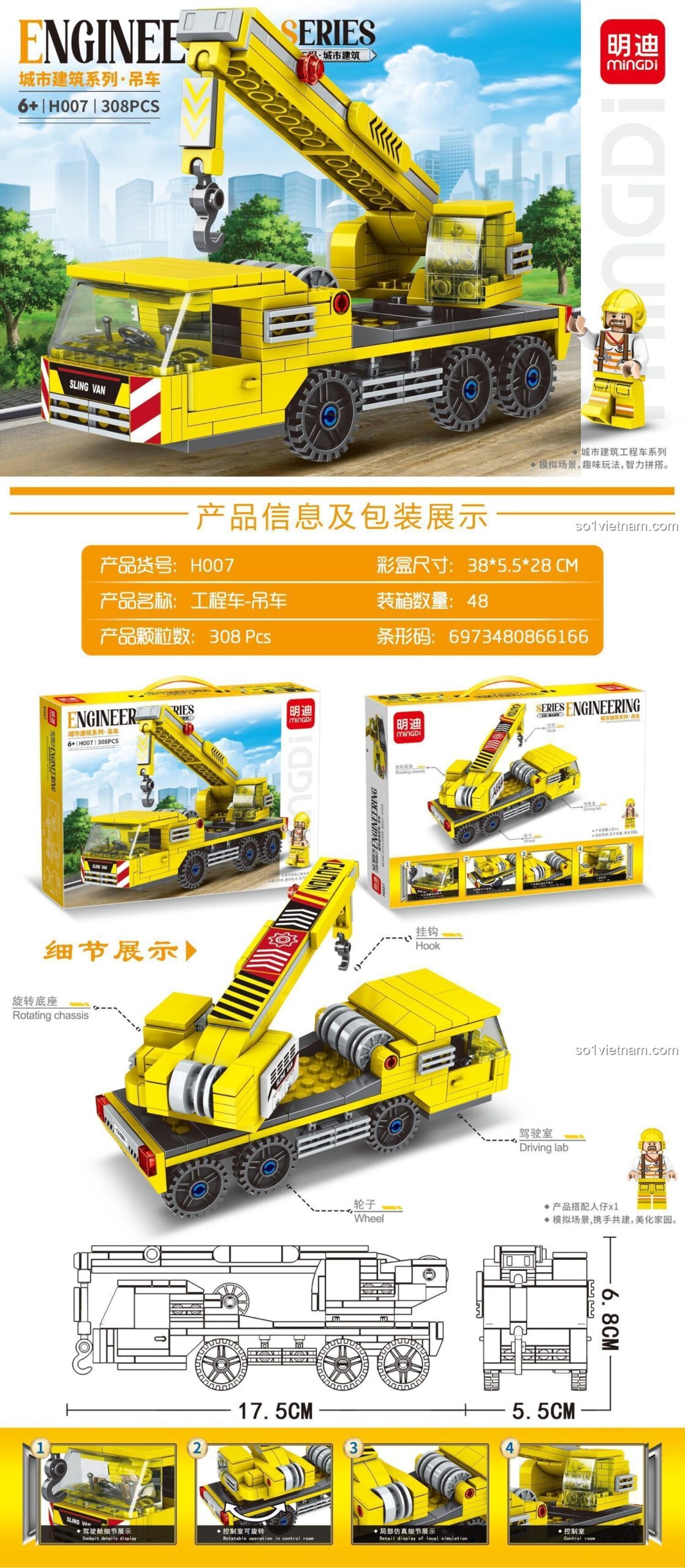 Bộ lắp ghép MingDi H007 Xe Cẩu Công Trình (308 mảnh ghép) – Sức Mạnh Công Trình và Cần Cẩu Xoay