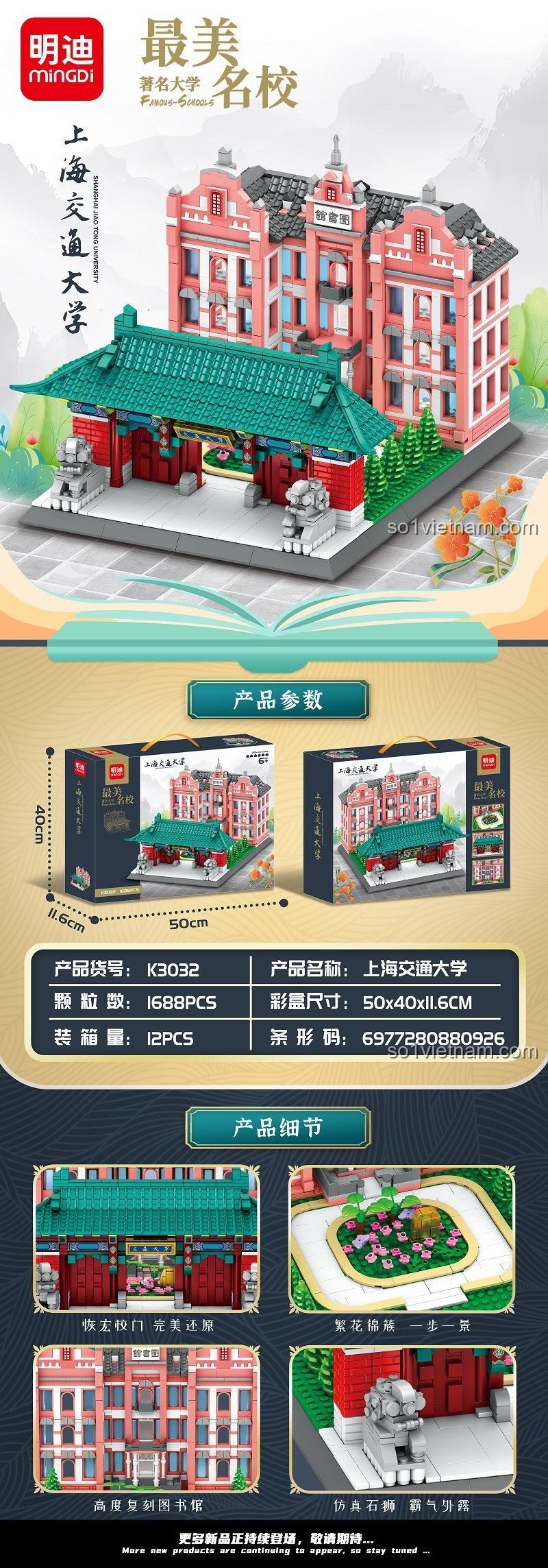Đại học Giao thông Thượng Hải, thành lập năm 1896, không chỉ là một trung tâm giáo dục hàng đầu mà còn là một di sản kiến trúc quý báu. Bộ lắp ghép MingDi K3032 không chỉ đơn thuần là tái hiện lại những tòa nhà, mà còn là cách để chúng ta tôn vinh lịch sử hình thành và phát triển của một trong những trường đại học uy tín nhất Trung Quốc. Mỗi mảnh ghép bạn đặt xuống là một bước bạn tiến gần hơn đến việc hiểu về bề dày lịch sử, về những giá trị tri thức mà ngôi trường này đã và đang gìn giữ.