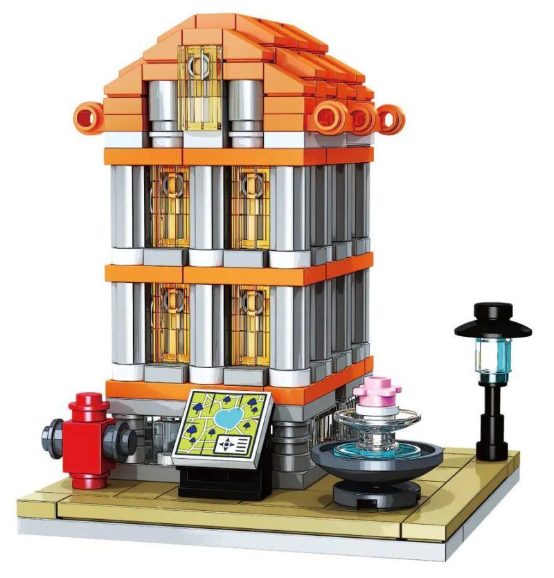Bộ lắp ghép JIESTAR 59081 nổi bật với thiết kế mô phỏng một quảng trường thu nhỏ, nơi có một tòa nhà kiến trúc độc đáo với gam màu cam, trắng, xám chủ đạo, tạo cảm giác hiện đại và tinh tế. Điểm nhấn của mô hình chính là sự xuất hiện của các chi tiết ngoại cảnh sinh động như: