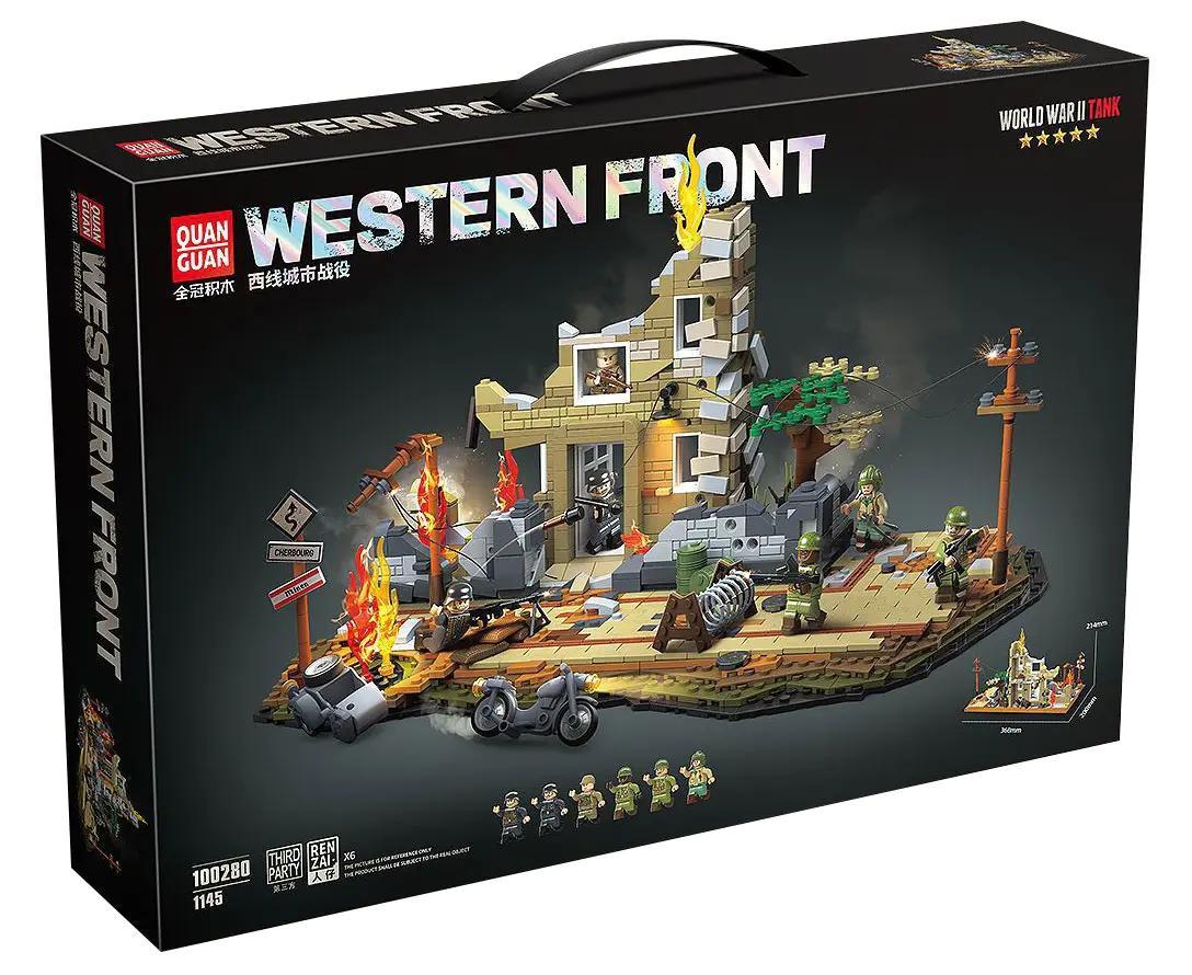 Bộ lắp ghép QUAN GUAN 100280 nổi bật với mô hình chi tiết cao, tái hiện chân thực cảnh quan chiến trường Thế chiến II, bao gồm các phương tiện quân sự, công trình đổ nát và các minifigures.