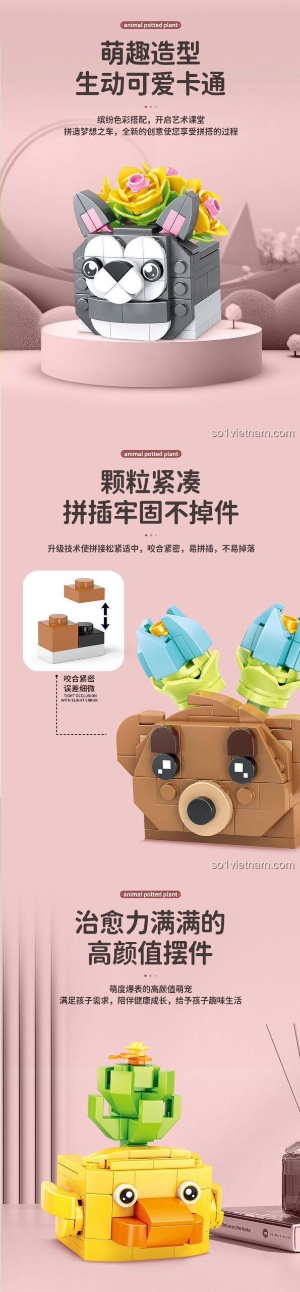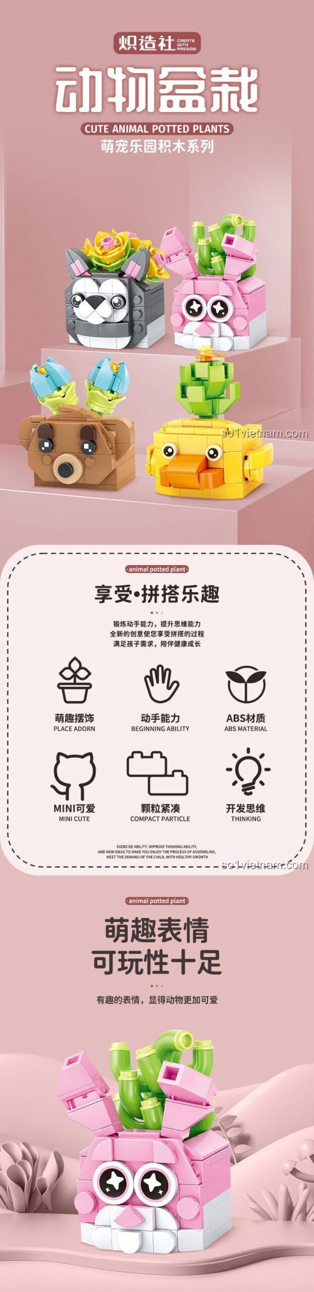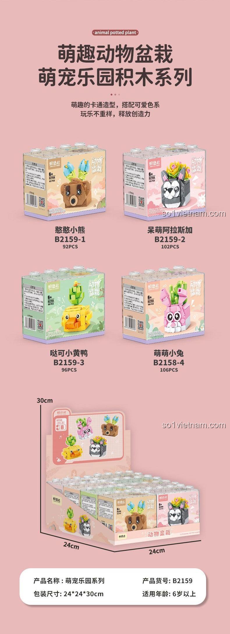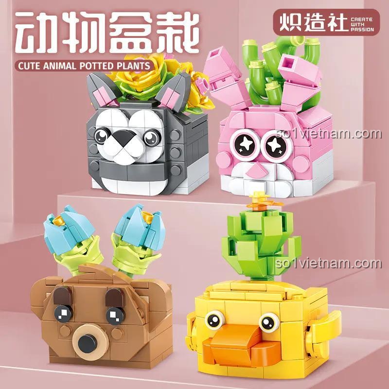 Bộ Chizao She B2159 bao gồm 4 mẫu động vật chậu cây khác nhau: Gấu nâu, Chó Husky, Vịt vàng và Thỏ hồng.
