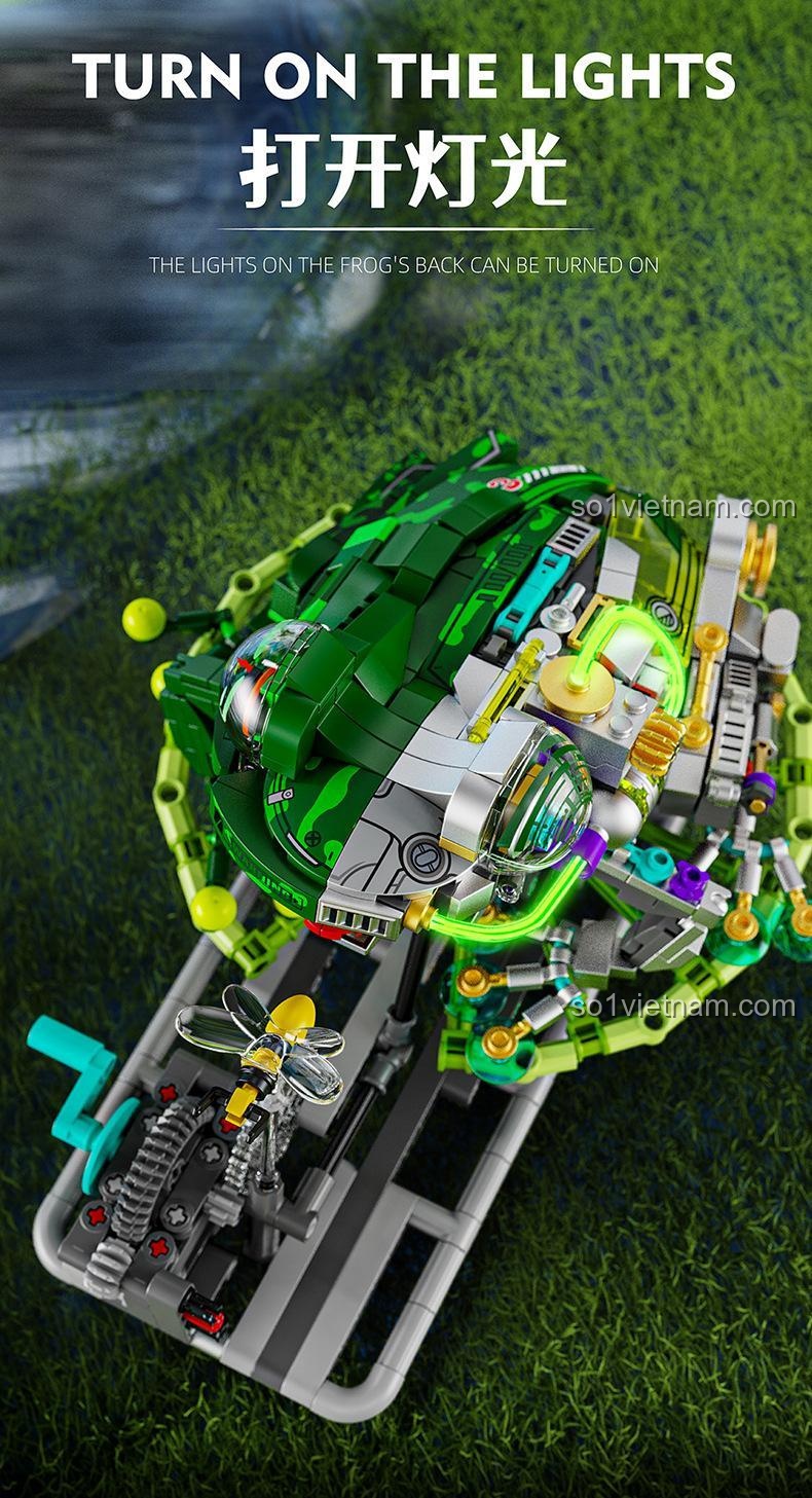 Mô hình nổi bật với cơ chế mô phỏng ếch ăn côn trùng thông qua hệ thống bánh răng, các khớp động linh hoạt cho phép tạo nhiều tư thế, và hệ thống đèn LED có thể bật tắt.