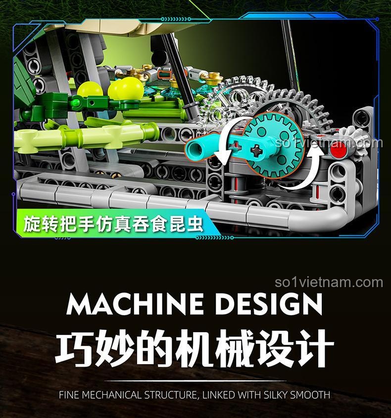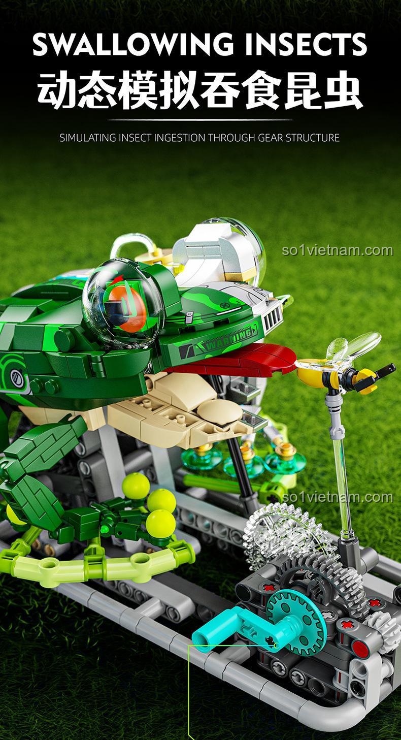 • Cơ Chế Ăn Côn Trùng Mô Phỏng: Điểm nhấn đặc biệt của mô hình là cơ chế quay tay tinh xảo, mô phỏng hoạt động ăn mồi của loài ếch. Bé sẽ thích thú khi khám phá cách các bánh răng và khớp nối hoạt động nhịp nhàng để tạo ra chuyển động này.