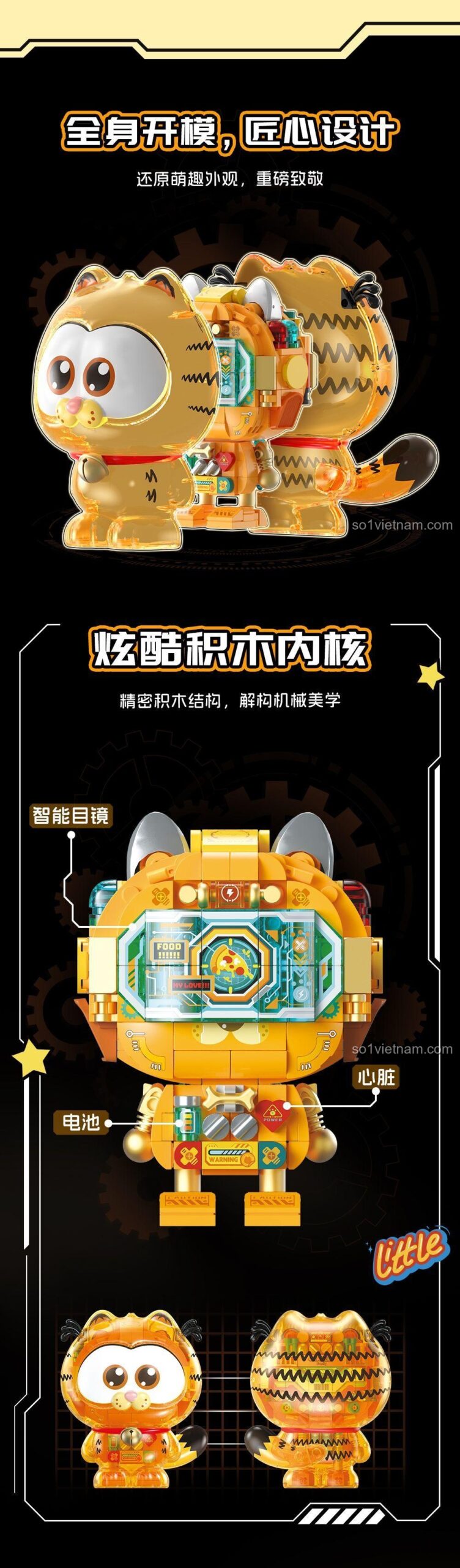 Điểm nhấn đặc biệt nhất của mô hình Garfield cơ khí nhỏ này chính là thiết kế trong suốt đầy ấn tượng. Bạn có thể nhìn xuyên qua lớp vỏ nhựa cao cấp để chiêm ngưỡng toàn bộ cấu trúc cơ khí phức tạp bên trong, từ “trái tim” máy móc, “bộ não” điều khiển cho đến “nguồn năng lượng” mô phỏng. Mỗi chi tiết đều được chăm chút tỉ mỉ, tái hiện sinh động các bộ phận như pin, bảng cảnh báo, nút nguồn, mang đến một cái nhìn độc đáo về thế giới cơ khí.