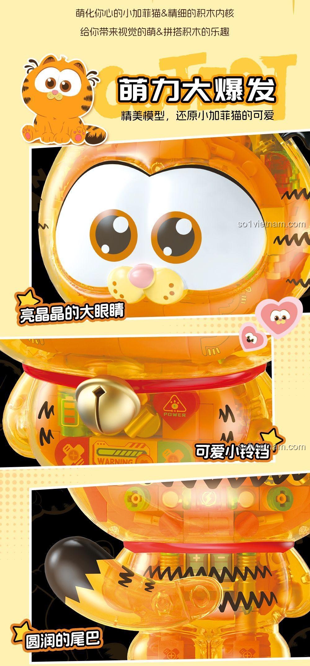 • Màu sắc sống động: Sự kết hợp hài hòa giữa sắc cam chủ đạo của Garfield, màu vàng của các chi tiết máy, cùng các điểm nhấn màu đen, trắng, đỏ tạo nên một tổng thể bắt mắt.
