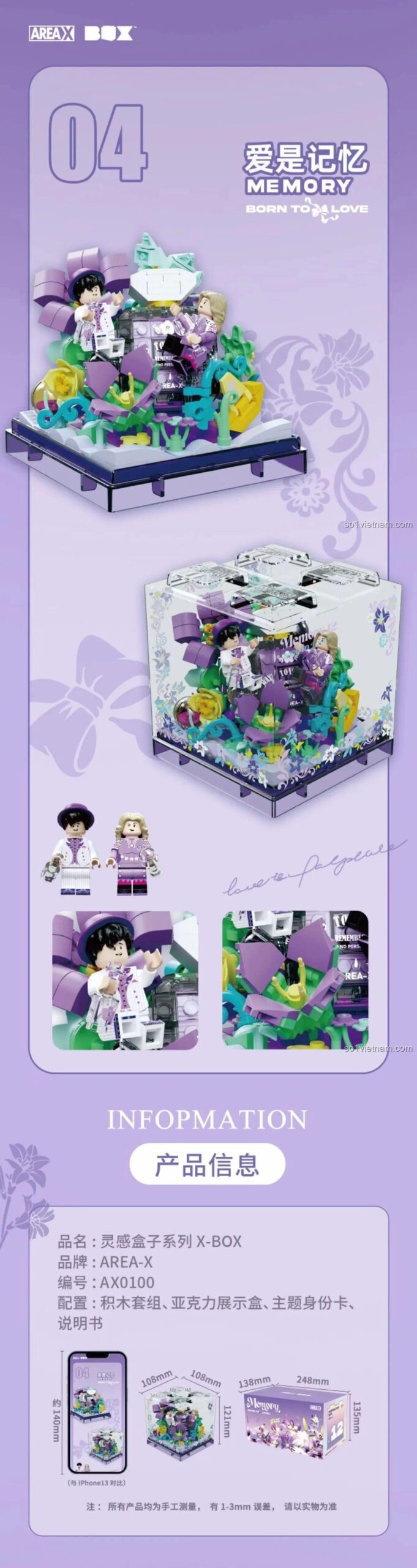Bộ lắp ghép AREA-X AX0100 “Born To Love: Memory” được thiết kế tỉ mỉ, tái hiện hình ảnh một hộp quà tình yêu lãng mạn với gam màu chủ đạo là tím, trắng, vàng và xanh lá, tạo nên một tổng thể hài hòa và đầy cảm xúc. Kích thước mô hình sau khi hoàn thành là 10.8 x 10.8 x 12.1 cm, vừa vặn để bạn trưng bày trên bàn làm việc, kệ sách hay bất kỳ không gian nào, như một lời nhắc nhở về tình yêu và những khoảnh khắc đáng nhớ.