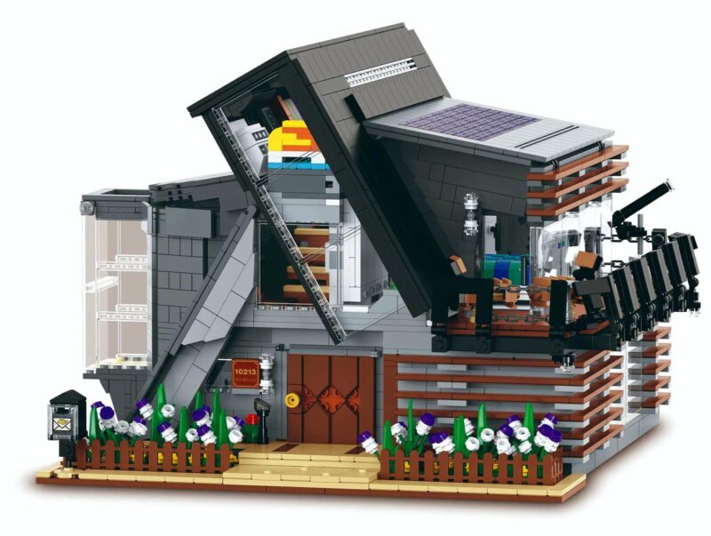 Ngôi Nhà Lambda 10213 nổi bật với thiết kế phân tầng độc đáo, tạo nên một kiến trúc đầy ấn tượng và khác biệt. Các chi tiết ngoại thất như hàng rào gỗ, những khóm hoa tím và trắng rực rỡ, cùng với cửa chính đôi trang nhã, tất cả đều được tái hiện một cách sống động. Đặc biệt, phần mái nhà được thiết kế với các tấm pin mặt trời, thể hiện xu hướng kiến trúc bền vững và thân thiện với môi trường.