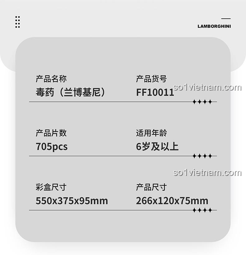 Bộ lắp ghép XingLeShi FF10011 mang đến một bản sao thu nhỏ đầy ấn tượng của siêu xe Lamborghini Poison huyền thoại. Với 705 mảnh ghép được thiết kế tỉ mỉ theo phong cách Technic, mô hình này không chỉ sở hữu vẻ ngoài hầm hố, mạnh mẽ đặc trưng của Lamborghini mà còn tái hiện chân thực các chi tiết kỹ thuật phức tạp.