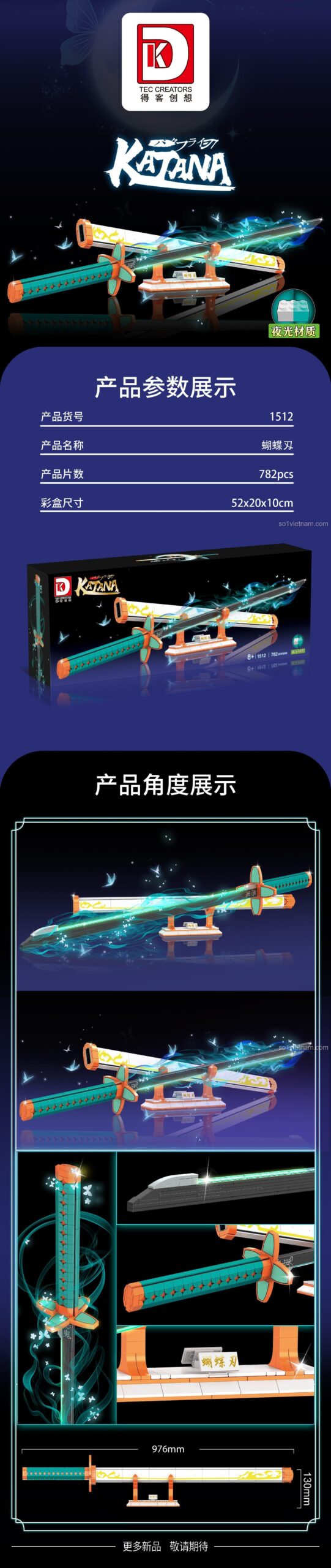 Thanh kiếm Bướm (胡蝶しのぶの刀 – Kochō Shinobu no Katana) là vũ khí đặc trưng của Shinobu Kocho, một nhân vật được yêu thích trong Demon Slayer: Kimetsu no Yaiba. Shinobu, Trùng Trụ của Sát Quỷ Đoàn, nổi bật với trí tuệ, sự nhanh nhẹn và phong cách chiến đấu độc đáo. Thanh kiếm của cô không chỉ là một vũ khí, mà còn là biểu tượng cho sự kiên cường, lòng nhân ái và ý chí chiến đấu không ngừng nghỉ để bảo vệ nhân loại khỏi lũ quỷ. Bộ lắp ghép DK 1512 cho phép bạn khám phá và cảm nhận vẻ đẹp cũng như ý nghĩa sâu sắc đằng sau thanh kiếm này, mang câu chuyện về lòng dũng cảm và sự hy sinh của Shinobu đến gần hơn với bạn.