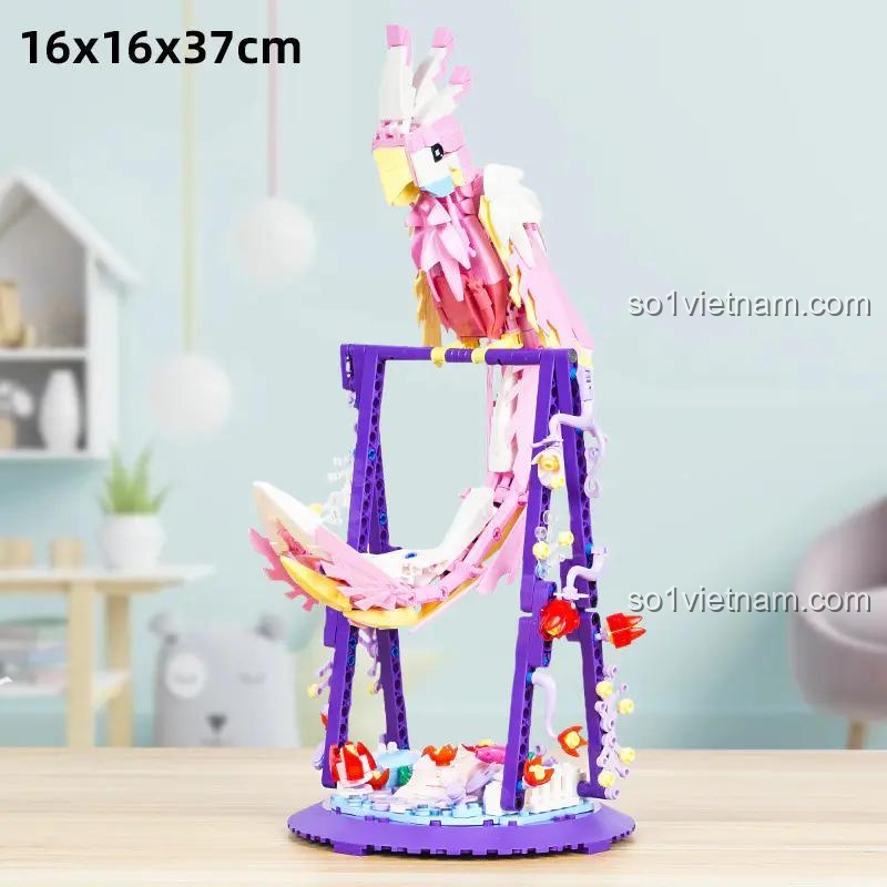 Với chiều cao ấn tượng 37cm và kích thước tổng thể 16x16x37cm, mô hình Vẹt Hoa DK 6014 nổi bật với thiết kế tinh tế và màu sắc hài hòa. Tông màu chủ đạo là hồng và tím, kết hợp với các chi tiết màu vàng, trắng và xanh lá cây, tạo nên một tổng thể vô cùng bắt mắt và sinh động. Mỗi mảnh ghép được chế tác tỉ mỉ, đảm bảo độ khít cao, giúp mô hình sau khi hoàn thành trông chắc chắn và đẹp mắt. Các chi tiết như lông vũ, mỏ, mắt, chân vẹt đều được mô phỏng chân thực, mang đến một tác phẩm nghệ thuật trang trí độc đáo, tô điểm thêm cho góc học tập, phòng ngủ hay bàn làm việc của bé, tạo nên một không gian tràn đầy cảm hứng và sáng tạo.