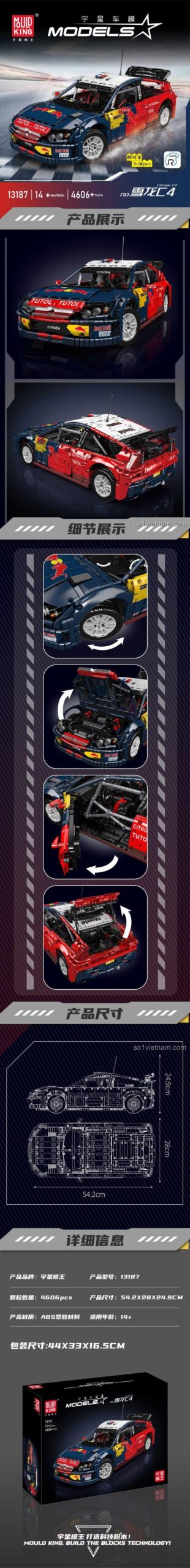 Chào mừng bạn đến với thế giới tốc độ và kỹ thuật đỉnh cao! Bộ lắp ghép Mould King 13187 mang đến cơ hội sở hữu một phiên bản mô hình siêu xe đua Citroen C4 WRC 2008 vô cùng ấn tượng, được chế tạo với tỉ lệ 1:8 và bao gồm tới 4606 mảnh ghép chi tiết. Đây không chỉ là một món đồ chơi, mà còn là một kiệt tác kỹ thuật, một thử thách thú vị cho những ai yêu thích sự tỉ mỉ và đam mê tốc độ.