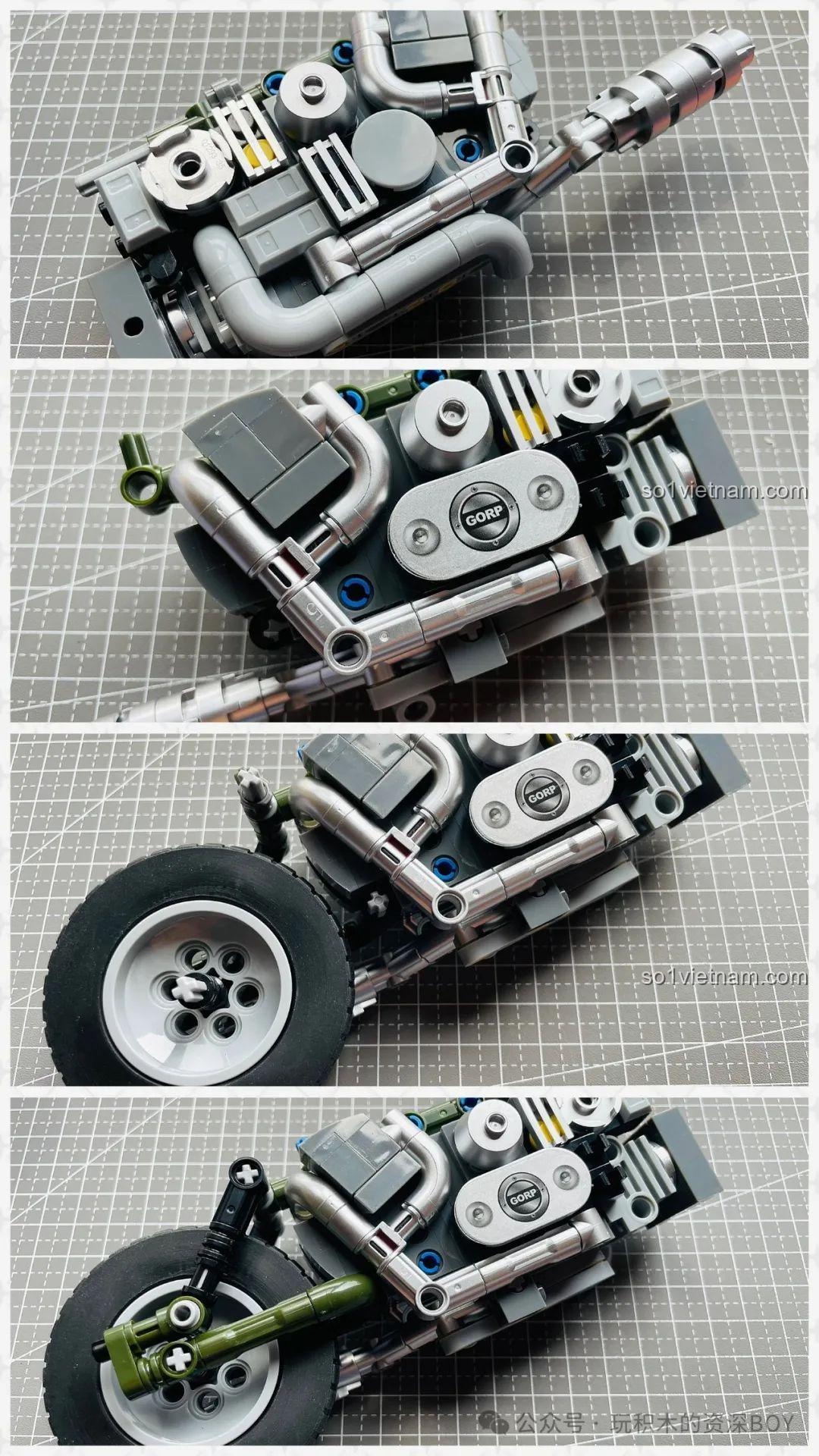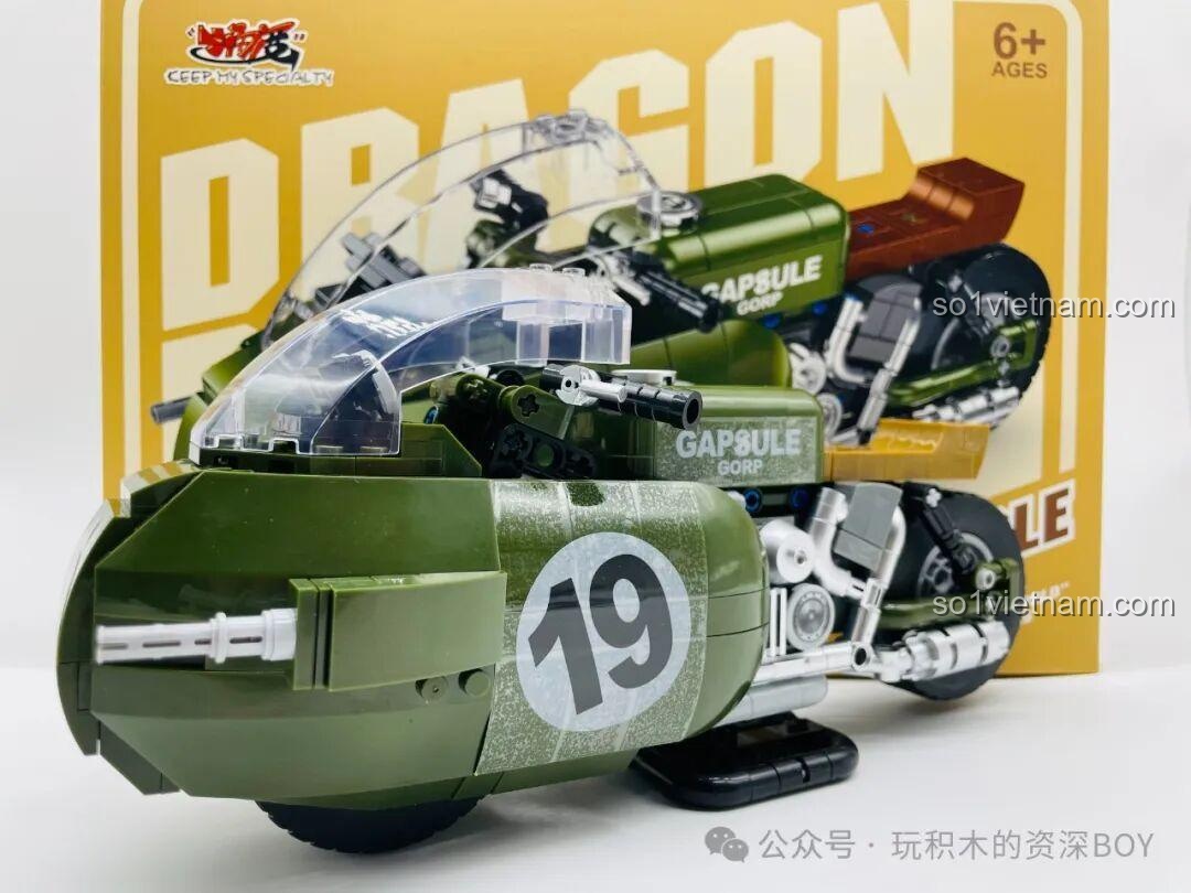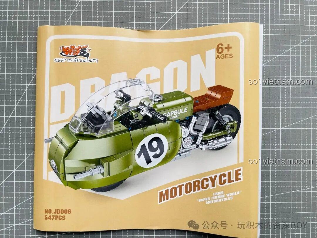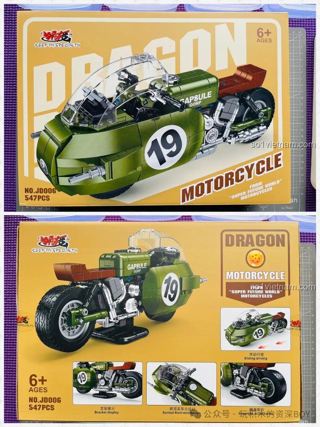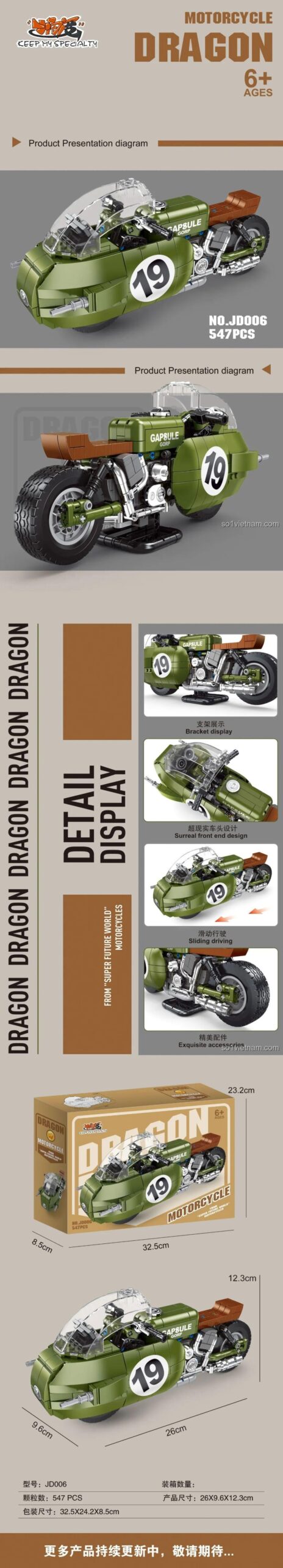 Bộ lắp ghép Xe máy Dragon JD006 tập trung vào việc tái hiện chi tiết thiết kế của chiếc xe máy “Bảy viên ngọc rồng” với 547 mảnh ghép. Mặc dù không có tính năng điện tử hay chuyển động phức tạp, vẻ ngoài tinh xảo và độ chính xác trong từng chi tiết đã làm nên sức hút đặc biệt của sản phẩm này.