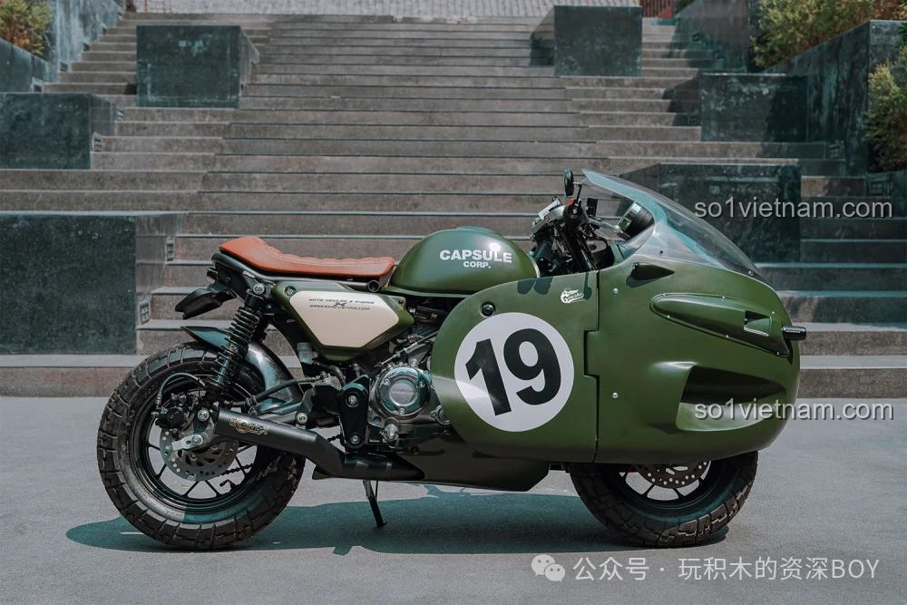- Màu sắc ấn tượng: Xe nổi bật với tông màu xanh lá chủ đạo, kết hợp cùng chi tiết màu nâu ở yên xe và các bộ phận kim loại sáng bóng, tạo nên vẻ ngoài cổ điển và mạnh mẽ.