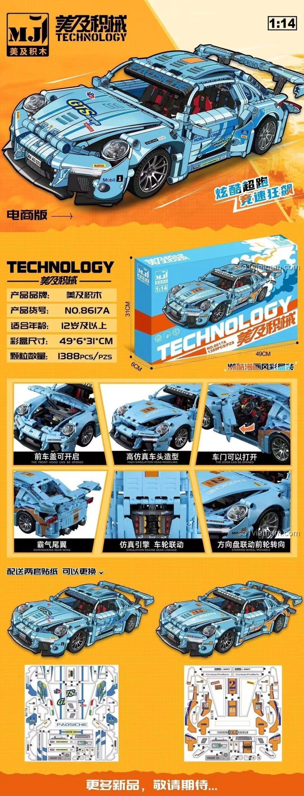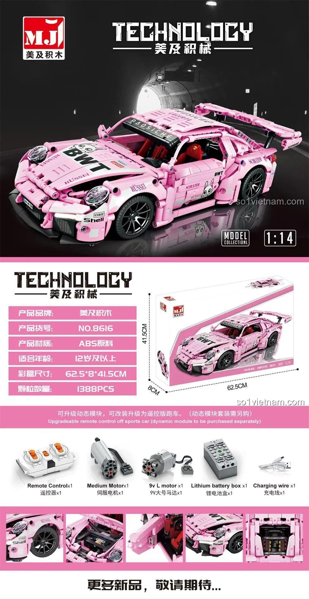 Chào mừng bạn đến với thế giới tốc độ đỉnh cao cùng bộ lắp ghép mô hình xe Porsche 911 (8616) đến từ thương hiệu uy tín 美及积木 (Mỹ Ký Tích Mộc). Lấy cảm hứng từ huyền thoại xe thể thao nước Đức, bộ mô hình này mang đến trải nghiệm lắp ráp chân thực và đầy thử thách, tái hiện sống động từng đường nét khí động học, nội thất tinh tế và khối động cơ mạnh mẽ của chiếc Porsche 911 huyền thoại. Với 1388 chi tiết sắc sảo, tỉ lệ 1:14 chuẩn xác và khả năng tùy biến lắp ráp thành 2 phiên bản khác nhau, đây chắc chắn sẽ là món quà tuyệt vời dành cho những người đam mê tốc độ, yêu thích xe hơi và mong muốn thử thách bản thân với những dự án lắp ráp phức tạp.