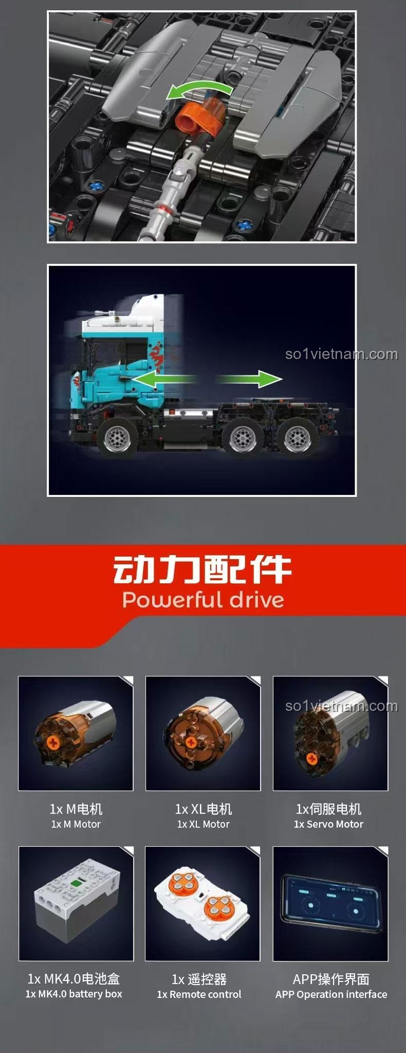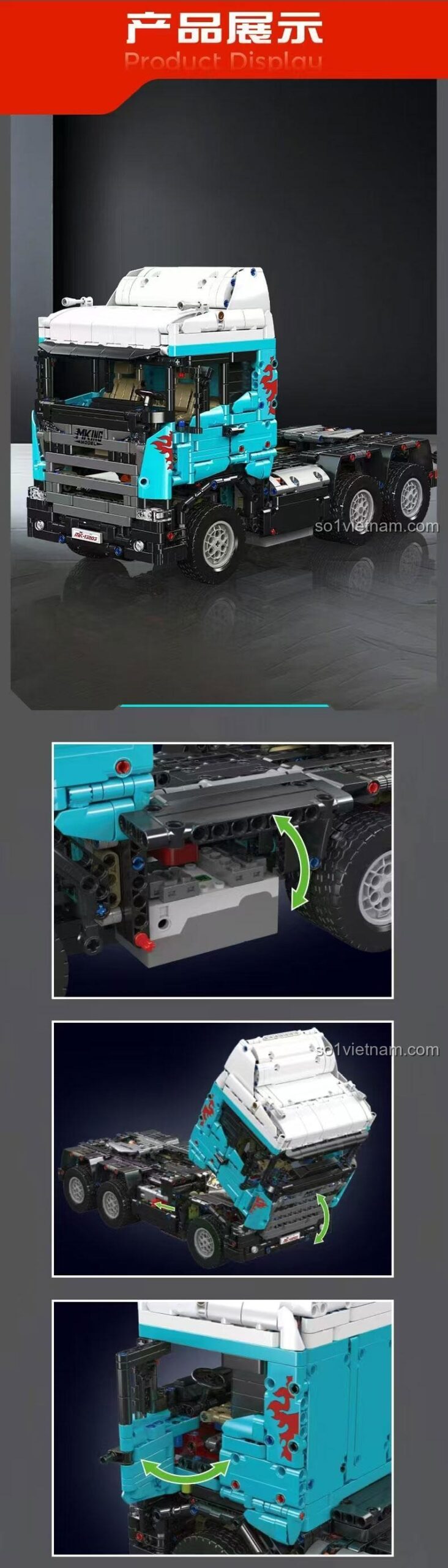 Điểm nhấn làm nên sự khác biệt của bộ lắp ghép Xe Đầu Kéo Scania Mould King 13203 chính là các tính năng điều khiển từ xa và động cơ mạnh mẽ. Mô hình được trang bị đầy đủ các bộ phận điện tử bao gồm động cơ pin có sẵn, bộ điều khiển từ xa và khả năng kết nối điện thoại thông minh qua ứng dụng (APP Operation interface). Điều này cho phép bé trai 14 tuổi điều khiển chiếc xe đầu kéo di chuyển tiến, lùi, rẽ trái, rẽ phải một cách mượt mà và chính xác. Ngoài ra, tính năng cabin lật độc đáo không chỉ tăng thêm tính chân thực mà còn giúp bé dễ dàng quan sát và tìm hiểu cấu tạo bên trong của động cơ mô phỏng. Hệ thống lái hoạt động linh hoạt, mang lại cảm giác như đang lái một chiếc xe tải thực thụ. Với đồ chơi mô hình 13203, bé không chỉ lắp ráp mà còn được trải nghiệm cảm giác làm chủ một cỗ máy kỹ thuật, phát triển kỹ năng điều khiển và phản xạ. Đây là một bộ lắp ghép Mould King 203 thực sự ấn tượng, mang đến những giờ phút giải trí và học hỏi không giới hạn.