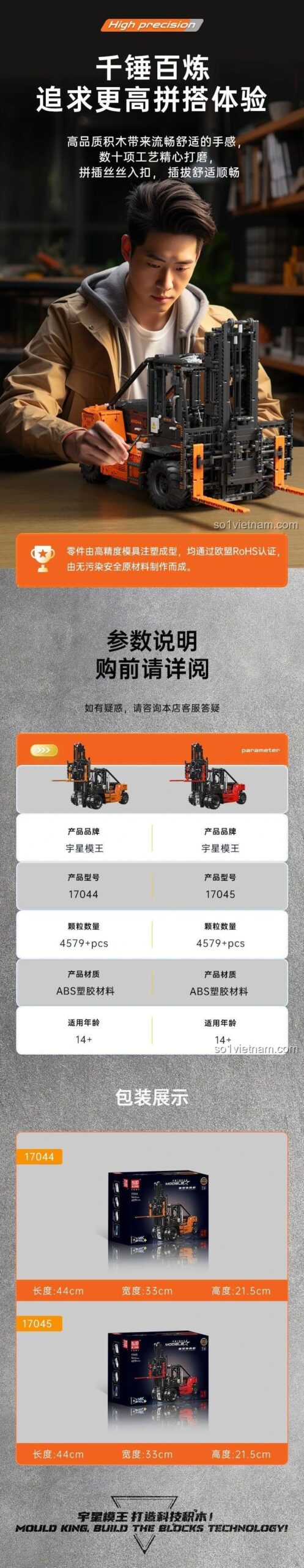 Mould King nổi tiếng với các sản phẩm tương thích LEGO® Technic có chất lượng rất tốt, độ khít cao và chi tiết sắc nét, gần như tương đương với LEGO® nhưng với mức giá phải chăng hơn nhiều. Xe Xếp Dỡ Hàng Hóa 17045 là một lựa chọn tuyệt vời để trải nghiệm công nghệ lắp ráp mà vẫn tiết kiệm chi phí.