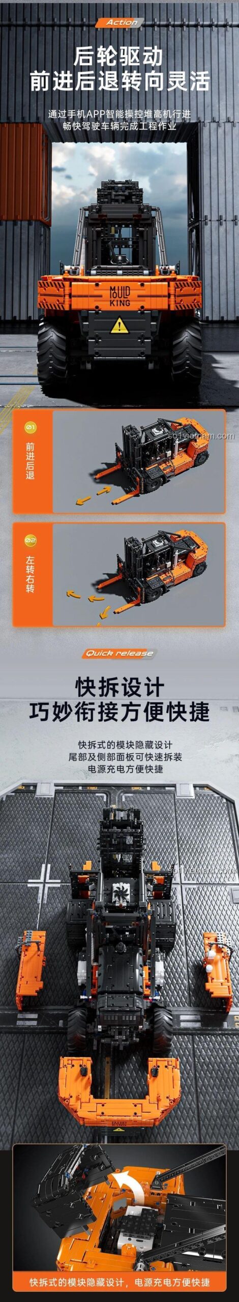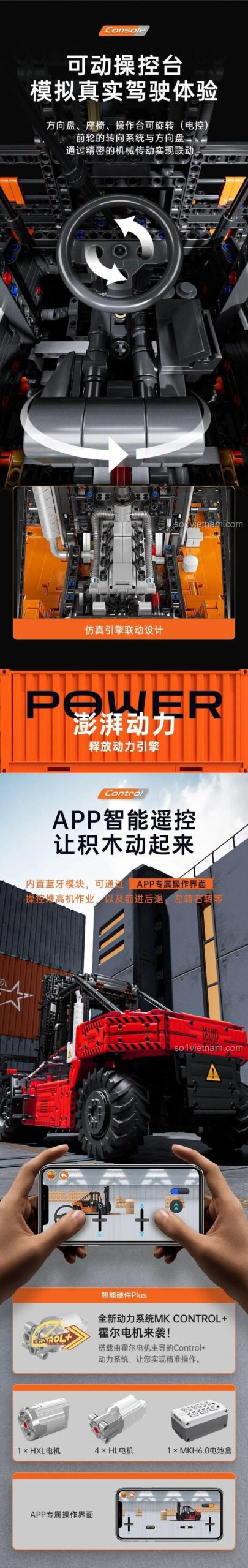 Mô hình được trang bị các động cơ và pin sạc, kết nối với điện thoại thông minh qua Bluetooth. Bạn chỉ cần tải ứng dụng Mould King về điện thoại, sau đó có thể điều khiển các chức năng của xe như di chuyển, nâng hạ càng, xoay cabin một cách trực quan và dễ dàng.