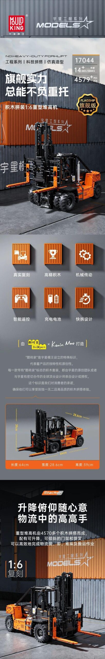 Mô hình Xe Nâng Hàng Tải Nặng Mould King 17045 được thiết kế với tỉ lệ 1:6 ấn tượng, tái hiện chân thực hình dáng và cấu trúc của một chiếc xe nâng container tải nặng ngoài đời thực. Với chiều dài 64cm, rộng 28.6cm và cao 39cm, đây là một mô hình đồ chơi lắp ráp có kích thước đáng nể, đủ để trở thành tâm điểm trong bất kỳ bộ sưu tập nào.