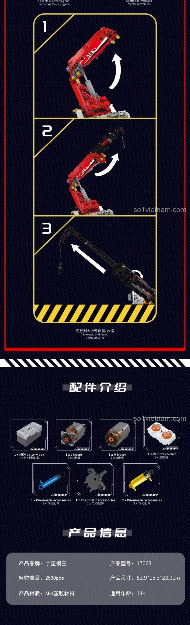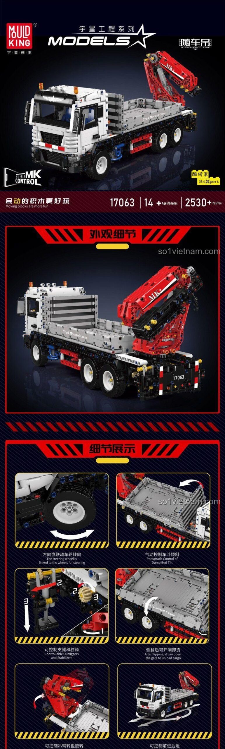 Mỗi mảnh ghép của đồ chơi lắp ráp Mould King 17063 đều góp phần tạo nên một tổng thể hoàn hảo, không chỉ đẹp mắt mà còn thể hiện sự phức tạp của kỹ thuật cơ khí. Đây là một mô hình Xe Tải Cần Cẩu Khí Nén Mould King mà bất kỳ con trai 14 tuổi nào cũng sẽ tự hào khi sở hữu và trưng bày.