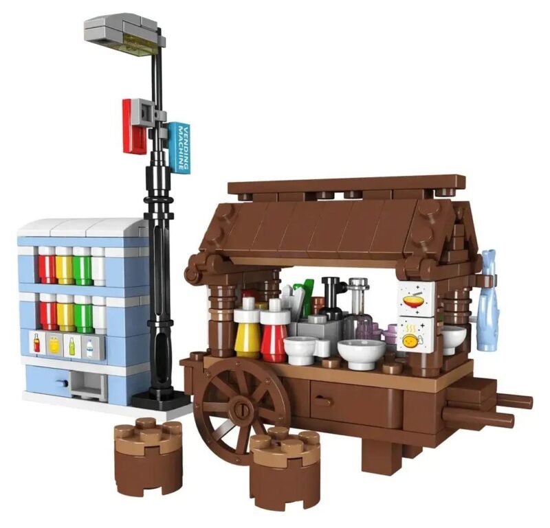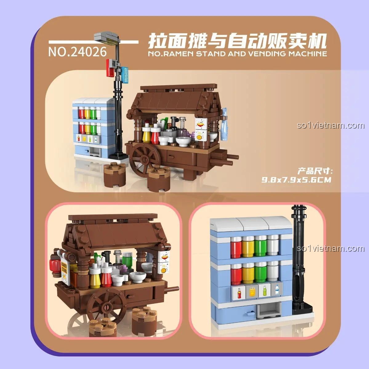Bộ lắp ghép Mould King 24026 nổi bật với thiết kế mô hình chi tiết cao, tái hiện chân thực xe đẩy bán mì Ramen và máy bán hàng tự động, mang đến trải nghiệm lắp ráp và trưng bày thú vị.
