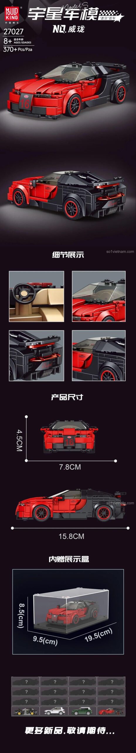 Kích thước mô hình sau khi hoàn thành là 16.5 cm chiều dài, 8 cm chiều rộng và 7 cm chiều cao, vừa vặn để trưng bày trên bàn học, kệ sách hoặc trong bộ sưu tập của bé. Từng chi tiết nhỏ như đèn pha, đèn hậu, mâm xe và thậm chí cả nội thất bên trong đều được chăm chút tỉ mỉ, mang lại cảm giác chân thực như đang chiêm ngưỡng một chiếc siêu xe thu nhỏ. Siêu xe Bugatti Veyron Mould King 27027 không chỉ là một món đồ chơi, mà còn là một tác phẩm nghệ thuật, thể hiện sự khéo léo và tinh tế trong thiết kế, chắc chắn sẽ làm hài lòng bất kỳ bé trai 8 tuổi nào có niềm đam mê với xe cộ.