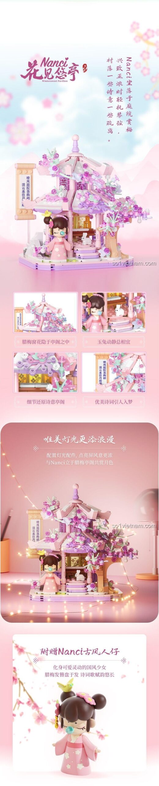 Bộ lắp ghép Nanci Hoa Kiến Du Đình TC2042 nổi bật với thiết kế cảnh quan Trung Hoa tinh xảo, hệ thống đèn LED lung linh tạo hiệu ứng ánh sáng huyền ảo, và đi kèm 2 minifigure Nanci đáng yêu. Đây là một bộ đồ chơi giáo dục STEM độc đáo, mang đến trải nghiệm lắp ráp và trang trí thú vị.