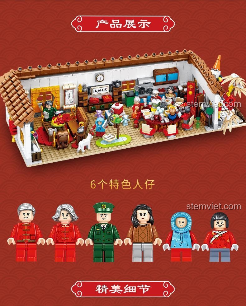 Bộ lắp ghép PanlosBrick 610009 Bữa Cơm Tất Niên là một kiệt tác thu nhỏ, tái hiện sống động không gian ấm cúng của một gia đình đang đón Tết. Với màu sắc chủ đạo là nâu của mái ngói và nội thất gỗ, đỏ rực của đèn lồng và trang phục truyền thống, cùng với sắc trắng tinh khôi của tường nhà và tuyết, bộ đồ chơi lắp ráp này mang đến một bức tranh hài hòa và đầy tính nghệ thuật. Từng mảnh ghép được thiết kế tỉ mỉ, tạo nên một mô hình chi tiết tinh xảo, từ những chiếc bàn ghế, mâm cỗ đầy ắp món ăn truyền thống cho đến những vật dụng trang trí nhỏ nhất. Đặc biệt, bộ đồ chơi xây dựng PanlosBrick 610009 đi kèm 6 minifigures đặc trưng, mỗi nhân vật đều có trang phục và biểu cảm riêng, thể hiện rõ nét không khí sum vầy của gia đình. Bé có thể dễ dàng nhận ra ông bà, bố mẹ và các con đang cùng nhau đón giao thừa. Dù không có kích thước mô hình cụ thể, nhưng qua hình ảnh, có thể thấy đây là một mô hình trưng bày ấn tượng, đủ lớn để bé thỏa sức sáng tạo và nhập vai. Bộ xếp hình PanlosBrick 610009 không chỉ là đồ chơi mà còn là một tác phẩm nghệ thuật, giúp bé phát triển cảm nhận thẩm mỹ và khả năng quan sát chi tiết. Hãy để bộ khối lắp ghép PanlosBrick 610009 này trở thành điểm nhấn độc đáo trong không gian sống của gia đình bạn, mang đến không khí Tết Đoàn Viên quanh năm!