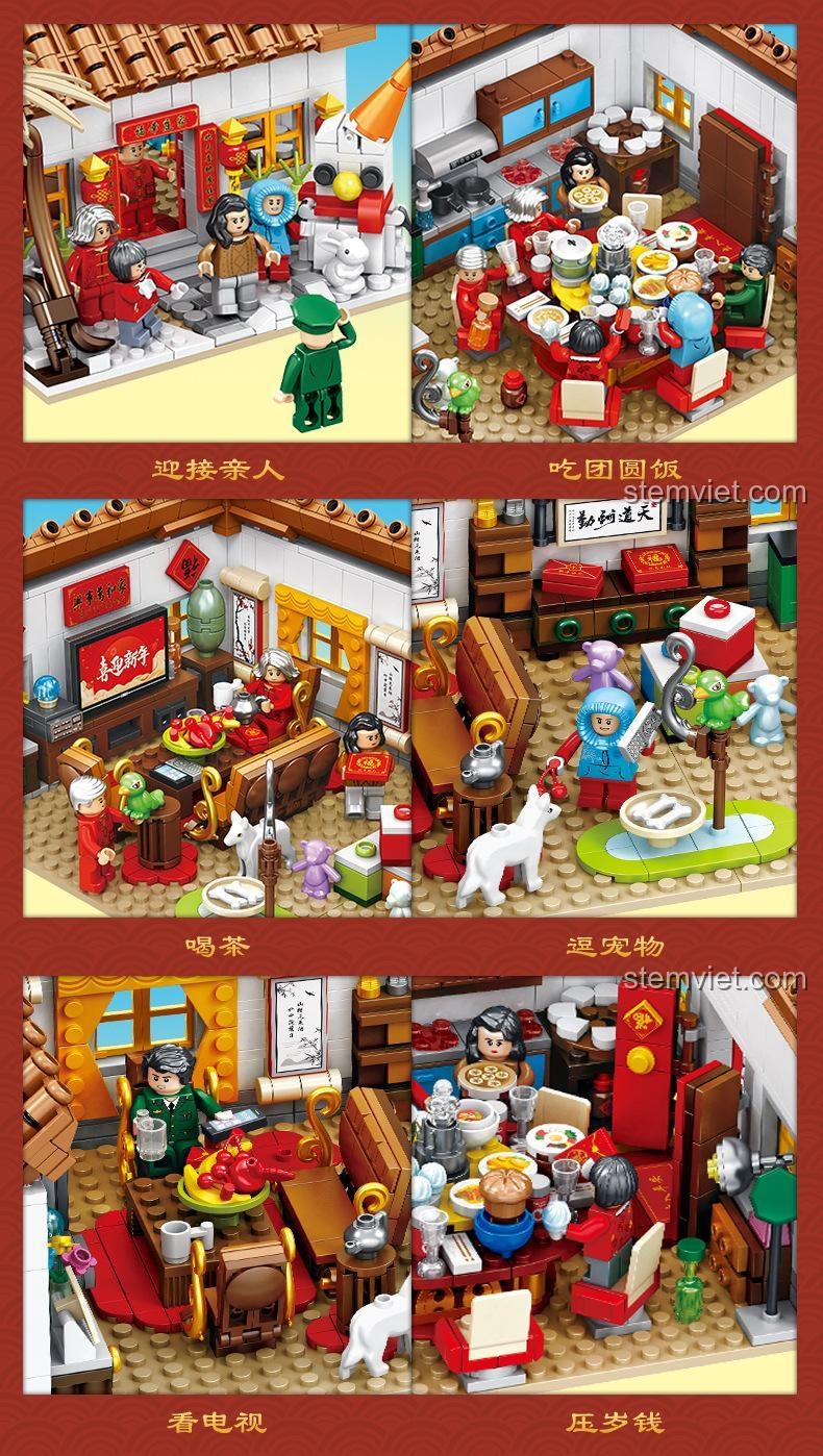 1. Đón Khách Quý: Bé có thể nhập vai thành gia chủ, sắp xếp các minifigures đón tiếp những vị khách quý đến chúc Tết, cùng nhau trò chuyện và thưởng thức bữa cơm tất niên.