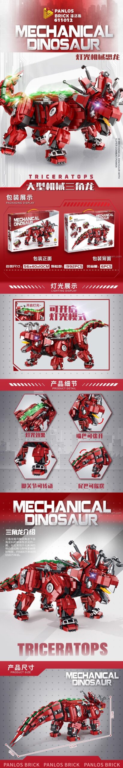 Ngay từ cái nhìn đầu tiên, bộ lắp ghép PanlosBrick 611012 Khủng long cơ khí Triceratops đã gây ấn tượng mạnh mẽ với thiết kế độc đáo và màu sắc chủ đạo là đỏ rực rỡ, điểm xuyết những chi tiết xanh lá cây nổi bật. Với kích thước mô hình ấn tượng: chiều dài 57cm, chiều rộng 17cm và chiều cao 21cm, đây là một mô hình khủng long ba sừng hoành tráng, đủ để trở thành tâm điểm trong bộ sưu tập của bất kỳ bé trai nào.