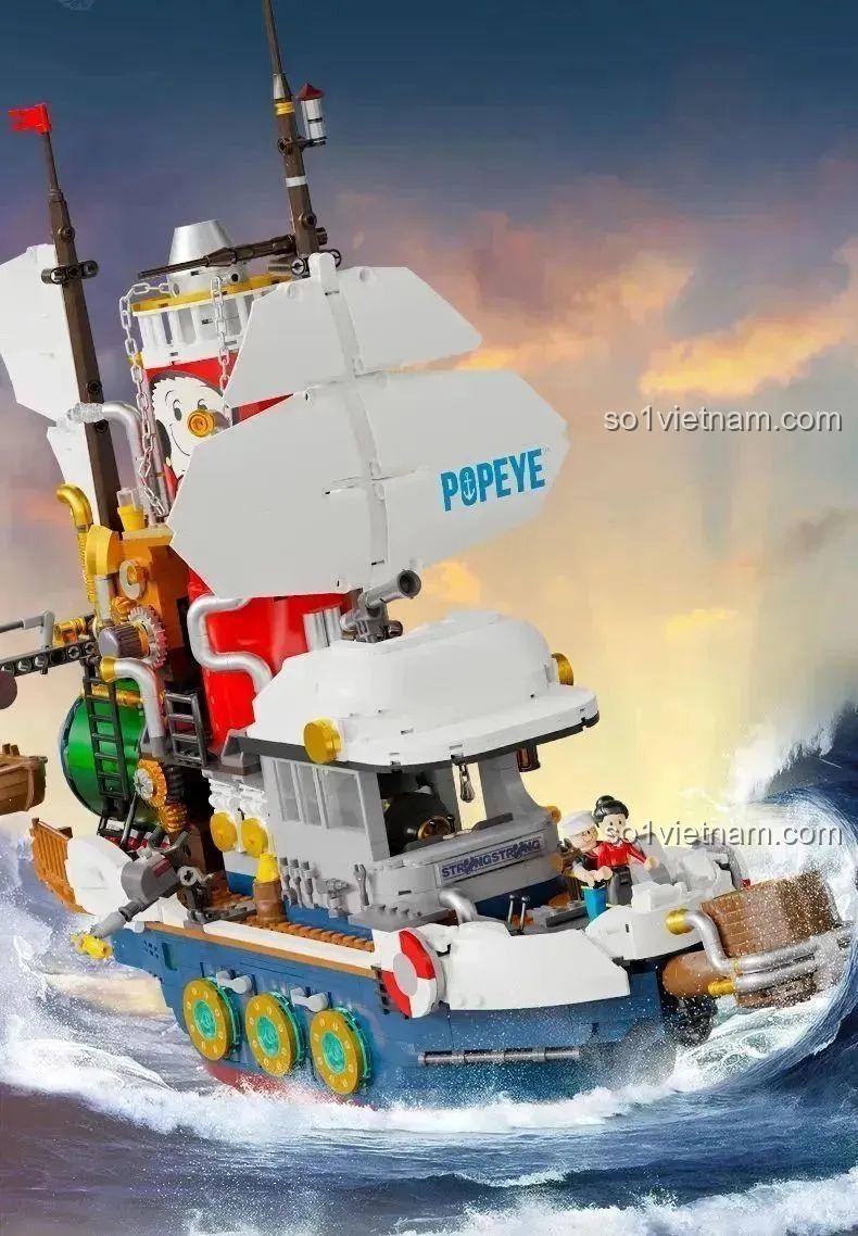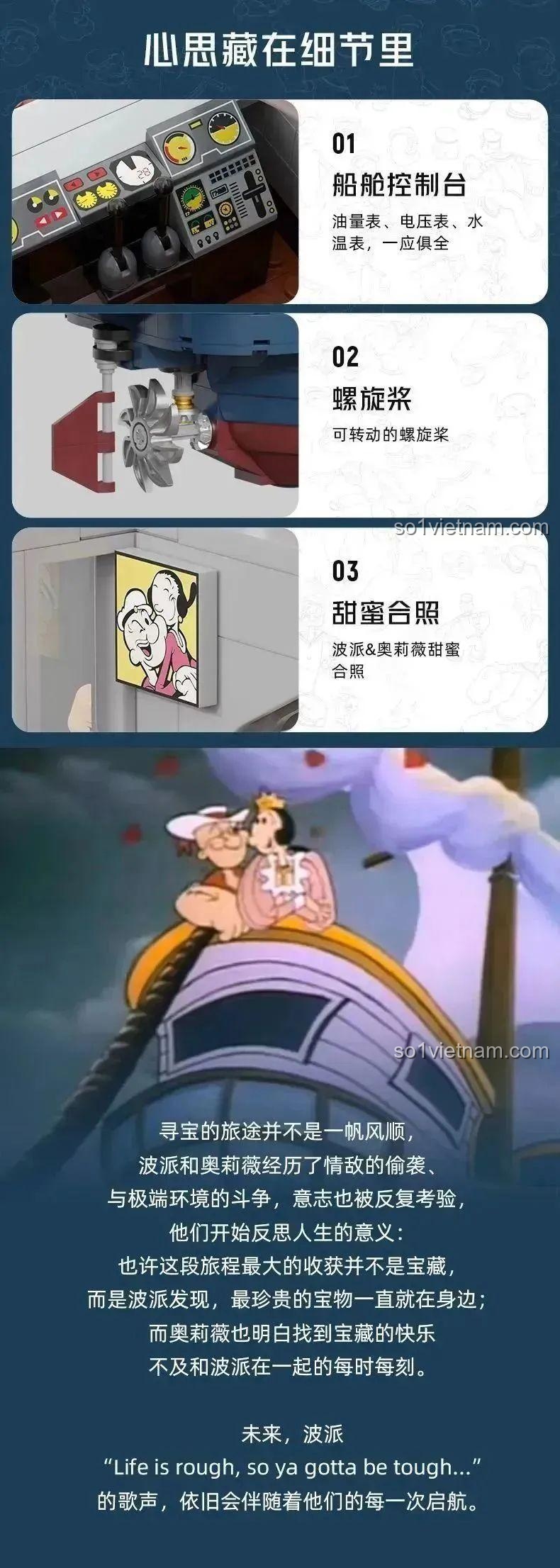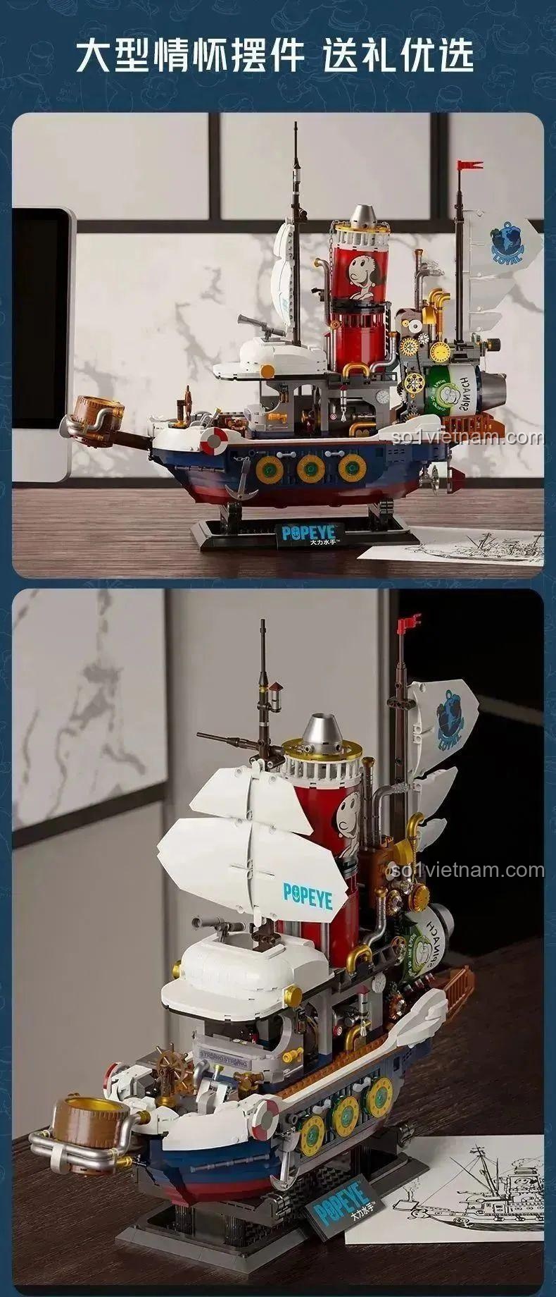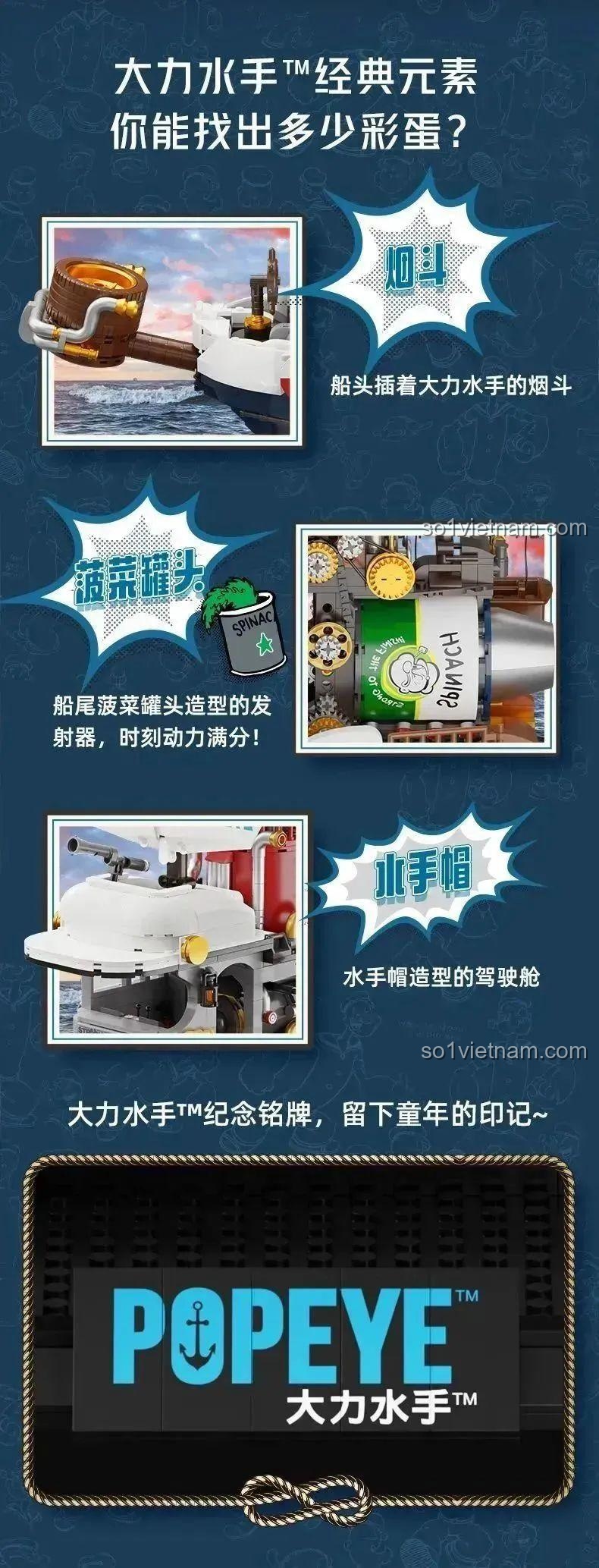 Bộ lắp ghép có nhiều chi tiết chuyển động như bánh lái, cánh buồm, khoang chứa kho báu bí mật, phòng tập thể hình và đặc biệt là “súng bắn rau chân vịt” mô phỏng sức mạnh của Popeye.