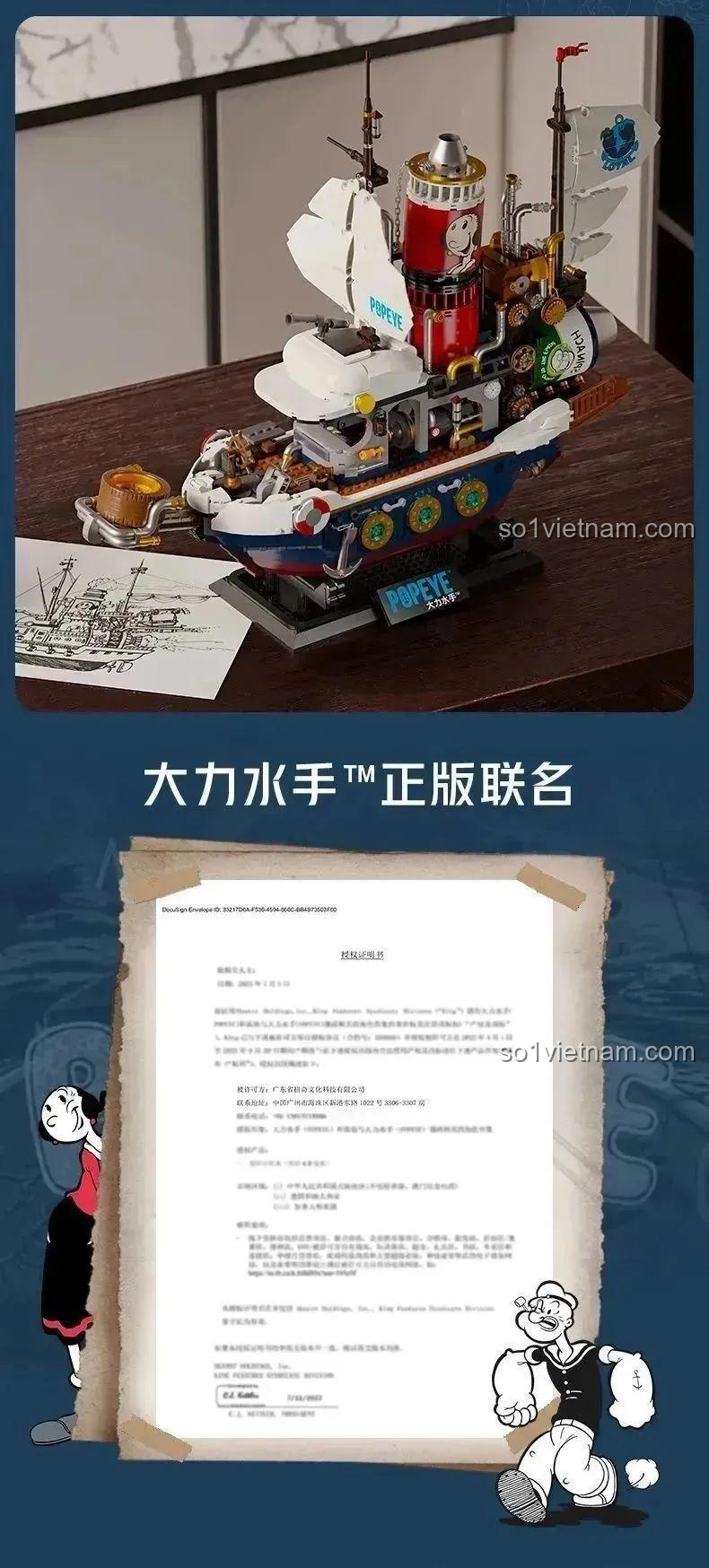 - Chi tiết mô phỏng chân thực: Từ bánh lái xoay được, ống khói độc đáo hình lon rau chân vịt, cánh buồm in logo Popeye, đến các chi tiết nhỏ như dây thừng, mỏ neo, pháo hiệu, tất cả đều được tái hiện một cách tỉ mỉ, mang đến cảm giác như đang chiêm ngưỡng một phiên bản thu nhỏ của con thuyền thật.