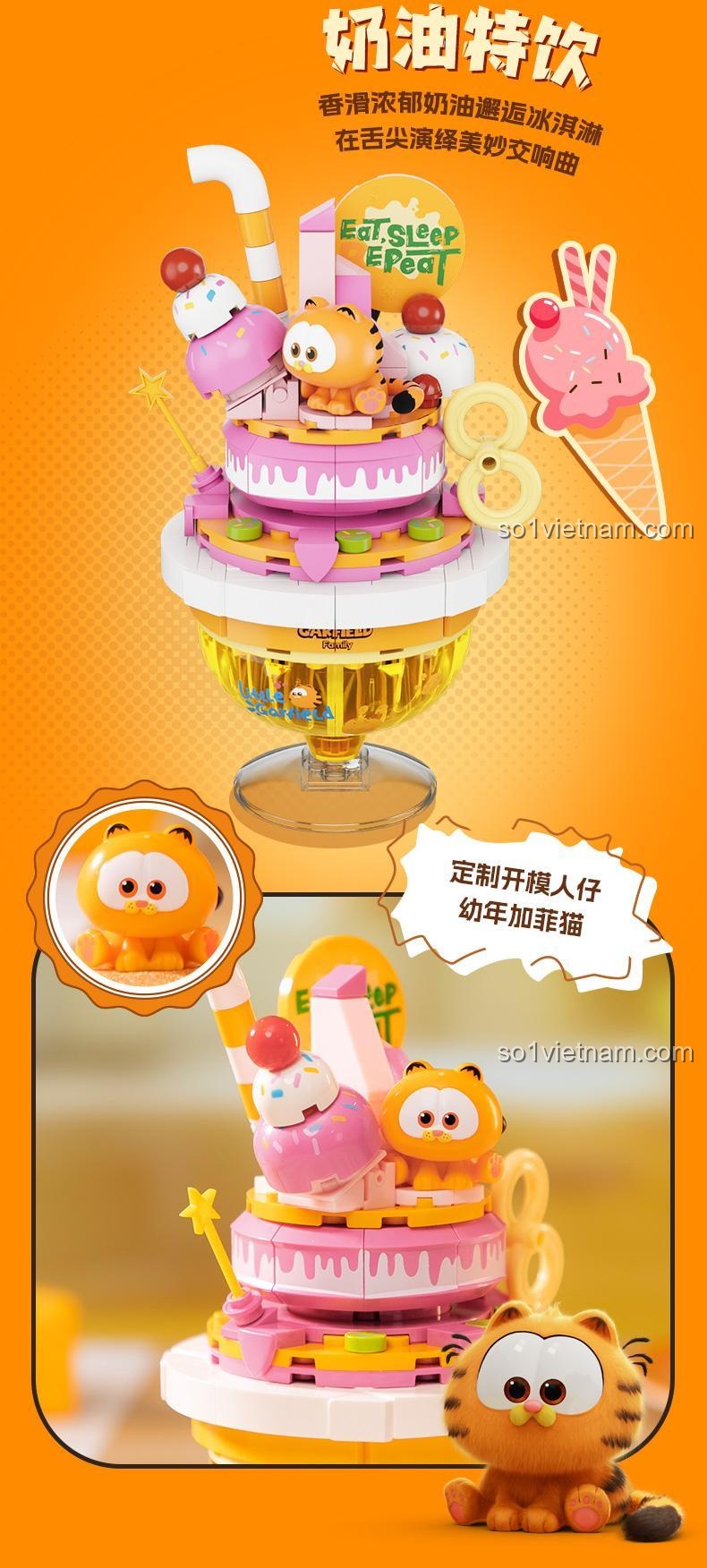 - Mô hình Garfield: Chú mèo Garfield quen thuộc với biểu cảm tinh nghịch, đáng yêu, được đặt ngay trên đỉnh ly kem, tạo điểm nhấn sinh động.